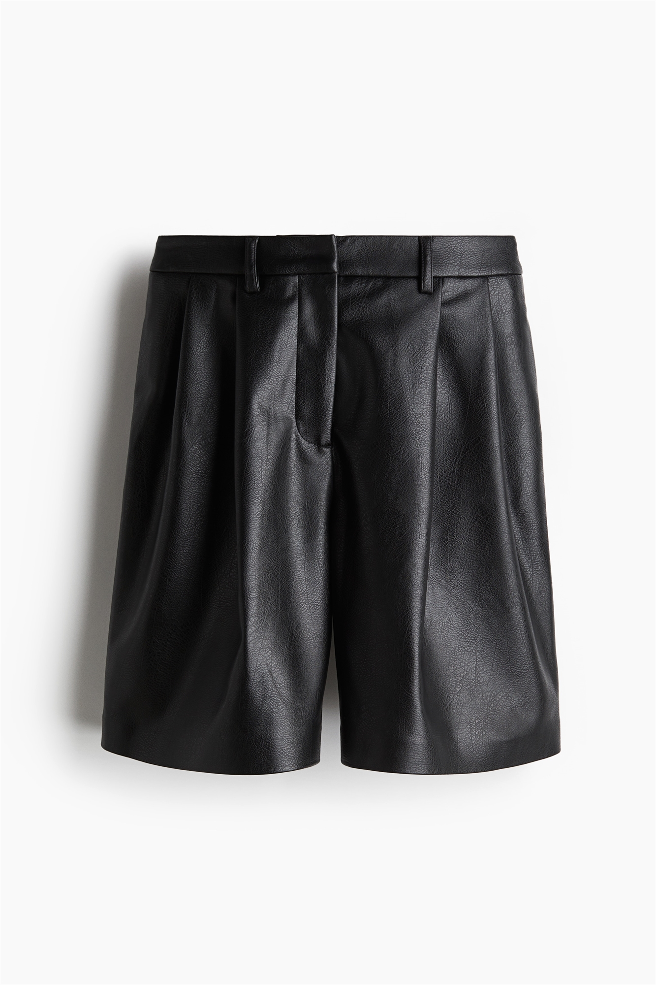 Шорты из лакированной ткани с ширинкой на молнии, потайной застежкой на пуговицу и крючок, неброскими боковыми карманами, задними карманами и длиной до колена со складками спереди.