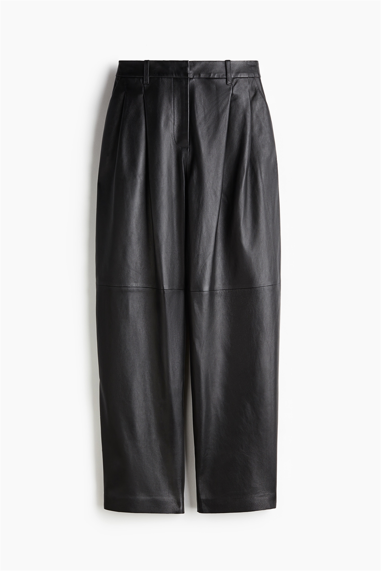 Свободные брюки из мягкой кожи с высокой талией, застежкой на молнию и удлиненным поясом с потайной застежкой на пуговицу и крючок с ушком. Диагональные боковые карманы, втачные задние карманы и прямые ноги со складками спереди и необработанным подолом.