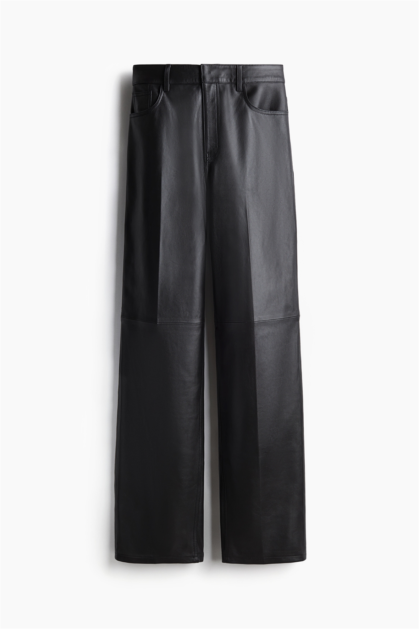 Брюки с 5 карманами из мягкой кожи, ширинка на молнии с потайной застежкой на крючок и глазок, прямые ноги со складками спереди и сзади.