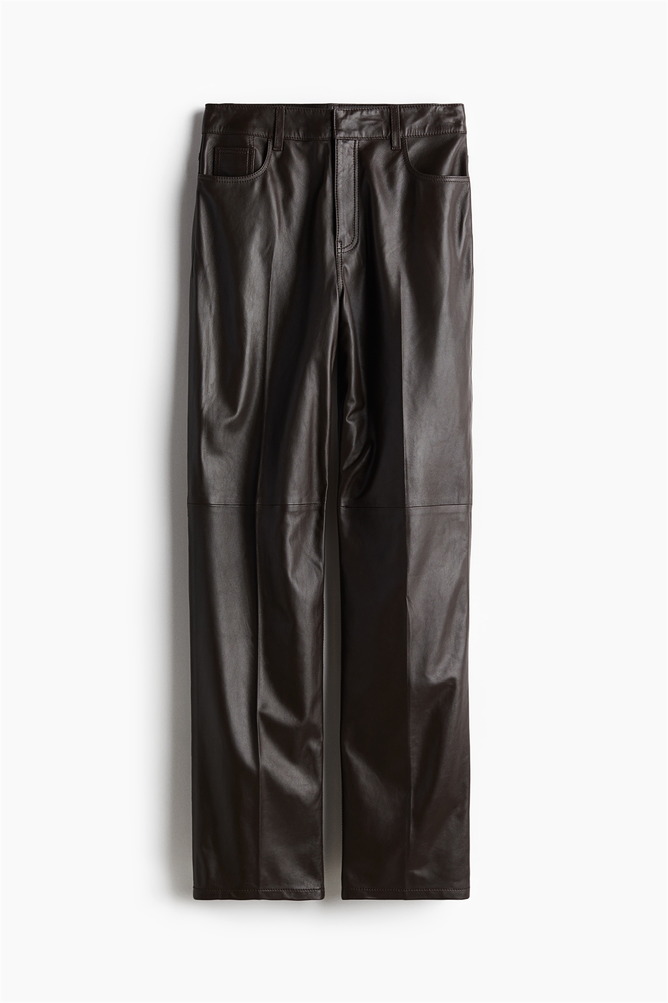 Брюки с 5 карманами из мягкой кожи, ширинка на молнии с потайной застежкой на крючок и глазок, прямые ноги со складками спереди и сзади.