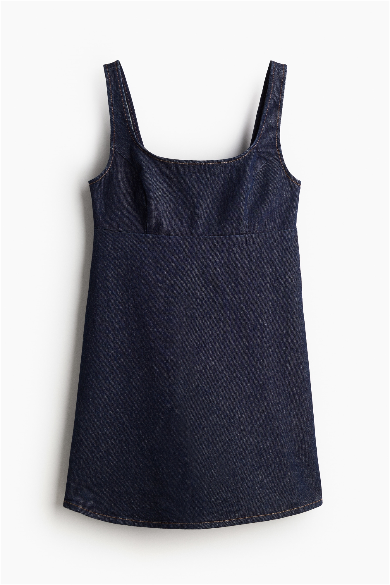 Короткое платье А-линии из хлопкового денима. Силуэт без рукавов, квадратный вырез и прямой подол. Без подкладки.