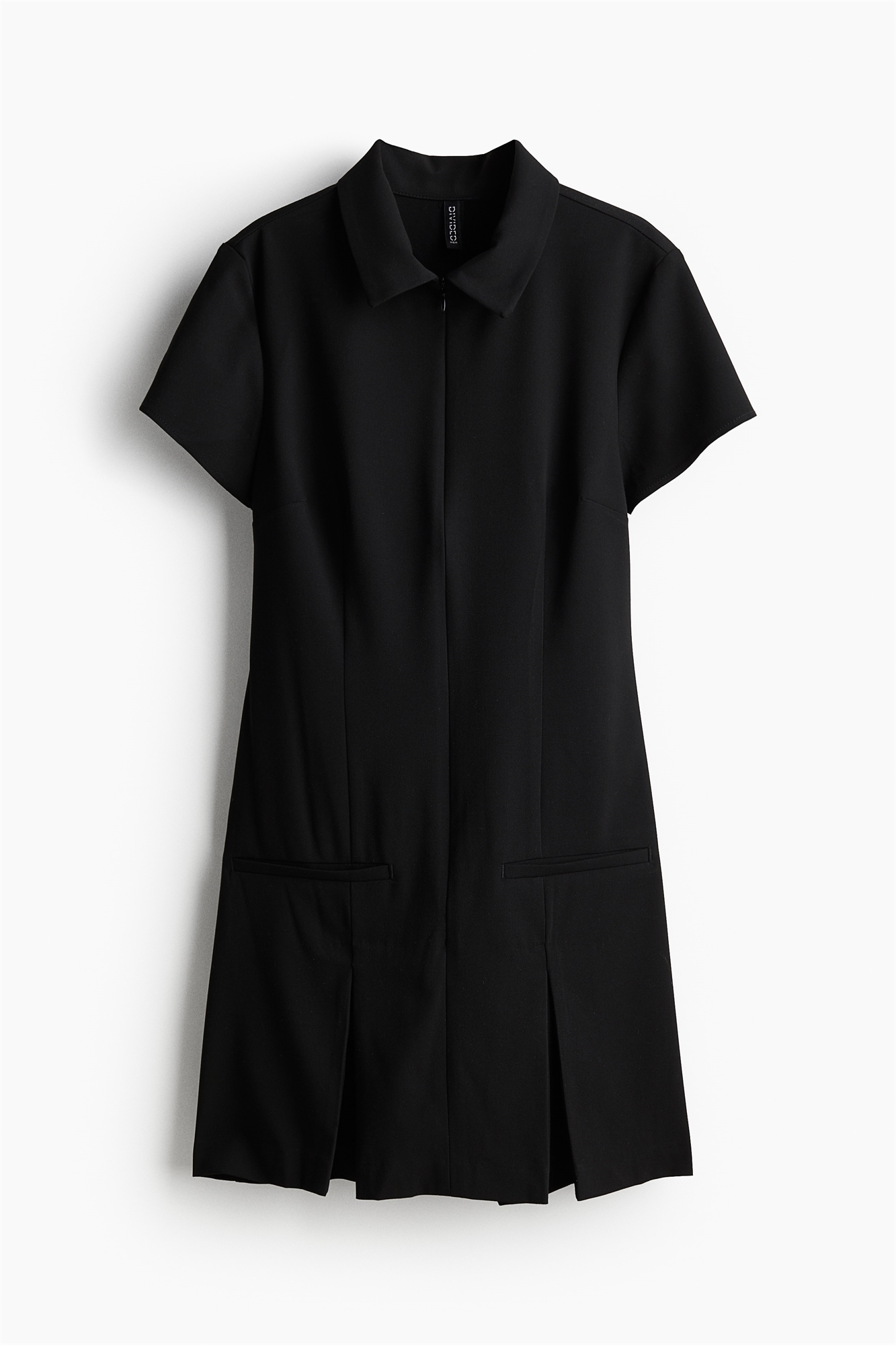 Короткое приталенное платье из саржи с воротником, потайной застежкой-молнией спереди и короткими рукавами. Заниженная талия, втачные карманы спереди и перевернутые боковые складки спереди и сзади на подоле. Без отделки.