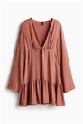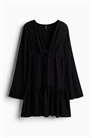Короткое платье из мягкого вискозного полотна с глубоким V-образным вырезом и узкими завязками по центру бюста. Длинные рукава и сборчатый шов над подолом для придания объема. Без подкладки.