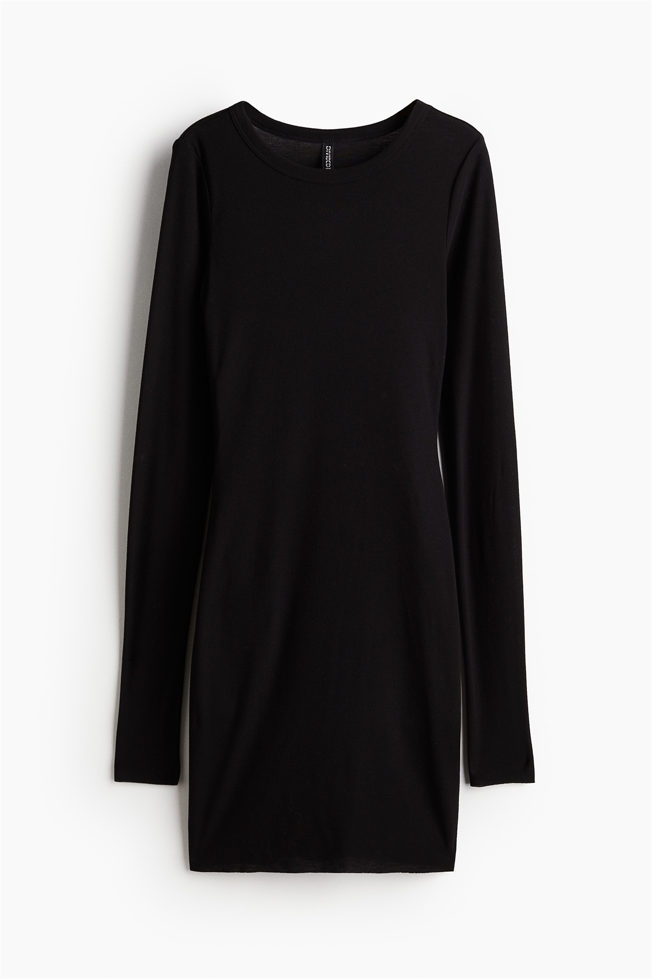Короткое приталенное платье из ребристого трикотажа с круглым вырезом и узкой окантовкой. Длинные рукава и необработанные края на манжетах и подоле.