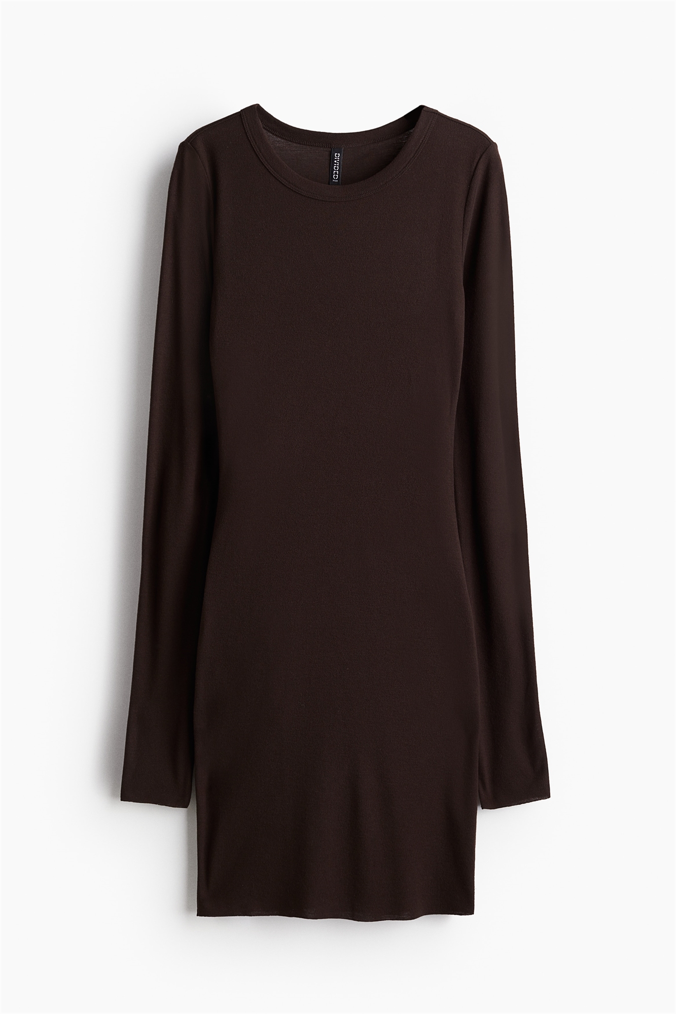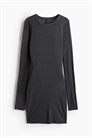 Короткое приталенное платье из ребристого трикотажа с круглым вырезом и узкой окантовкой. Длинные рукава и необработанные края на манжетах и подоле.