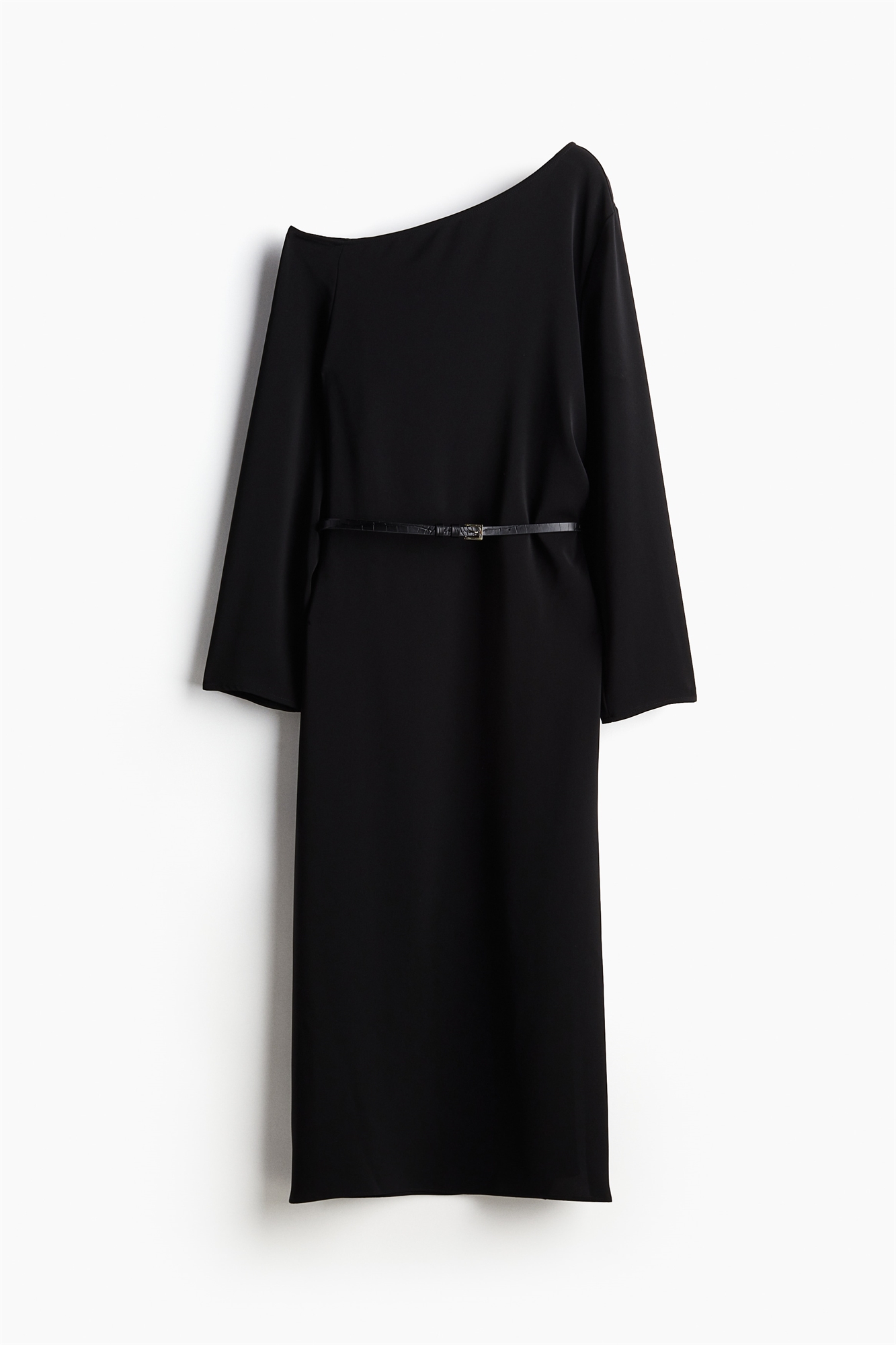 Платье длиной до колена из тканого материала с асимметричным вырезом с одним оголенным плечом, потайной застежкой на молнию сзади и длинными рукавами. Узкий съемный пояс из ткани с покрытием и подол прямого кроя с разрезом с одной стороны. Без подкладки.