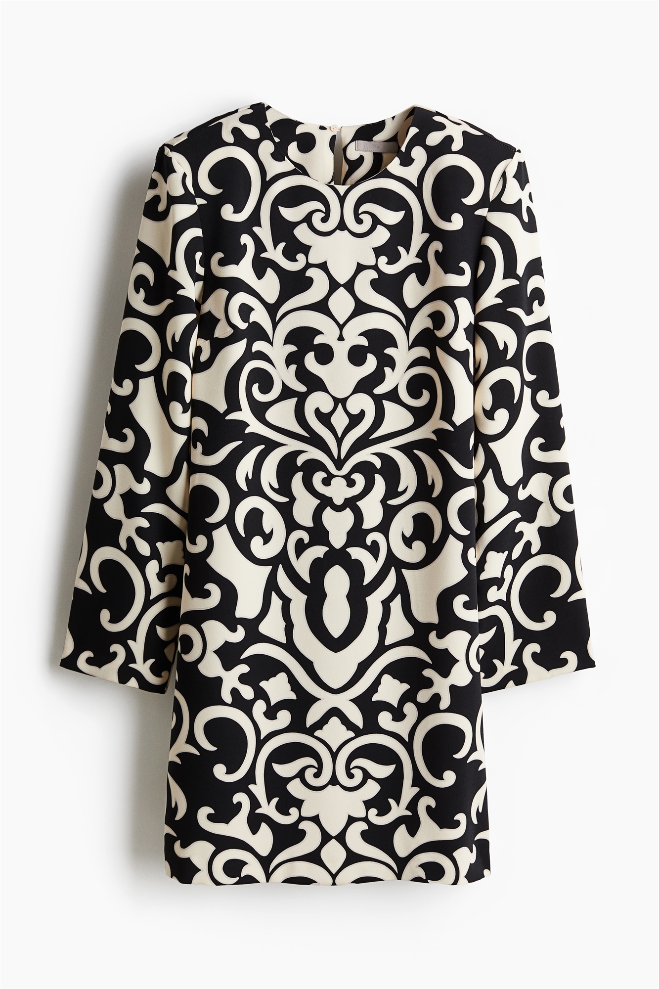 Короткое платье из тканого материала с круглым вырезом и прорезью для ключа с потайной пуговицей сзади. Вытачки на груди, подплечники и длинные рукава. Без подкладки.