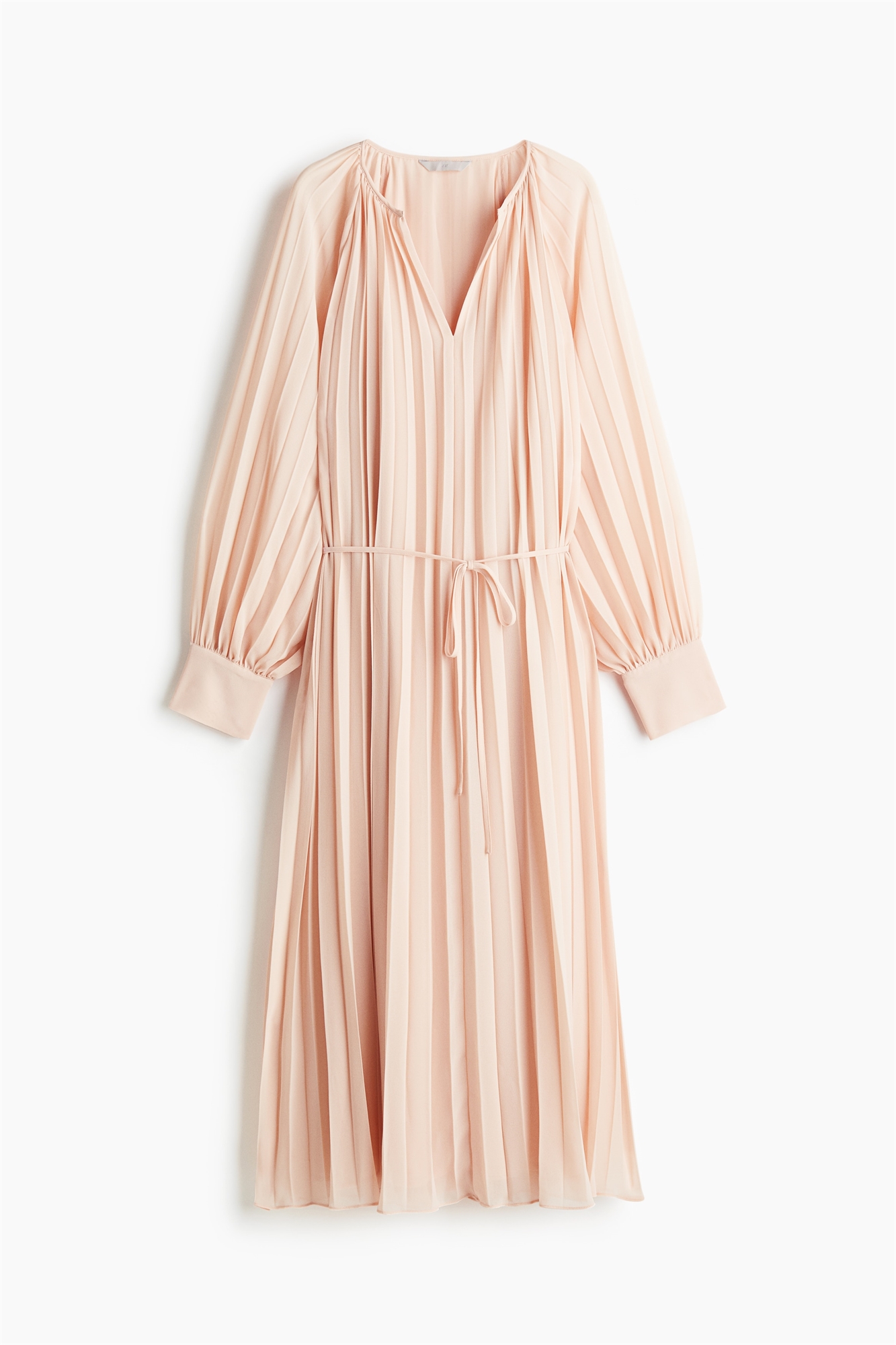 Платье длиной до колена из плиссированного шифона с круглым вырезом и V-образной проймой спереди. Длинные рукава реглан с разрезом и пуговицей на манжетах. Узкий съемный пояс-завязка на талии. Частично на подкладке.