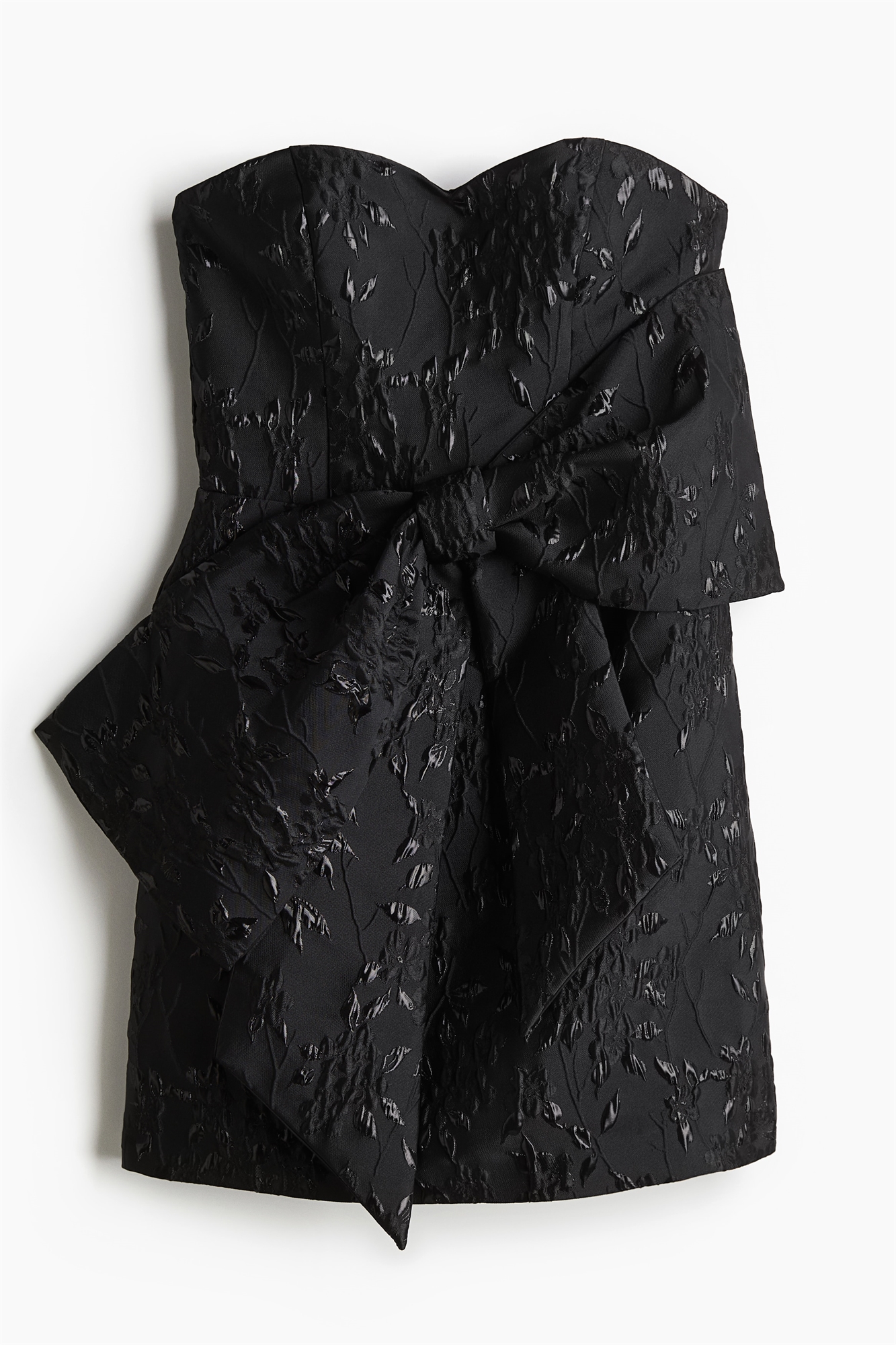 Короткое приталенное платье-бандо из переливающегося жаккардового переплетения с объемным бантом спереди. Вырез в форме сердца со скрытой силиконовой отделкой в верхней части, чтобы платье держалось на месте. Скрытая застежка-молния и застежка-крючок с одной стороны, а также платочная вставка сзади. Атласная подкладка.