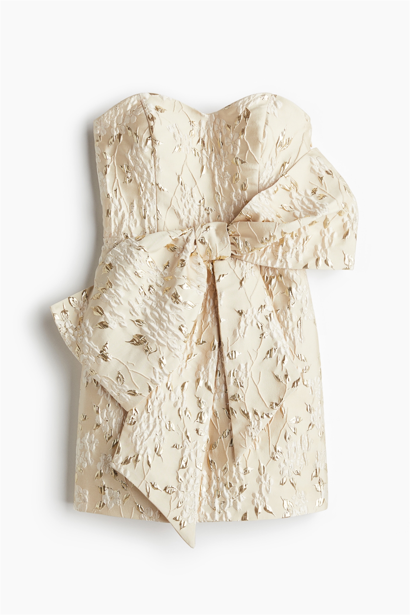 Короткое приталенное платье-бандо из переливающегося жаккардового переплетения с объемным бантом спереди. Вырез в форме сердца со скрытой силиконовой отделкой в верхней части, чтобы платье держалось на месте. Скрытая застежка-молния и застежка-крючок с одной стороны, а также платочная вставка сзади. Атласная подкладка.