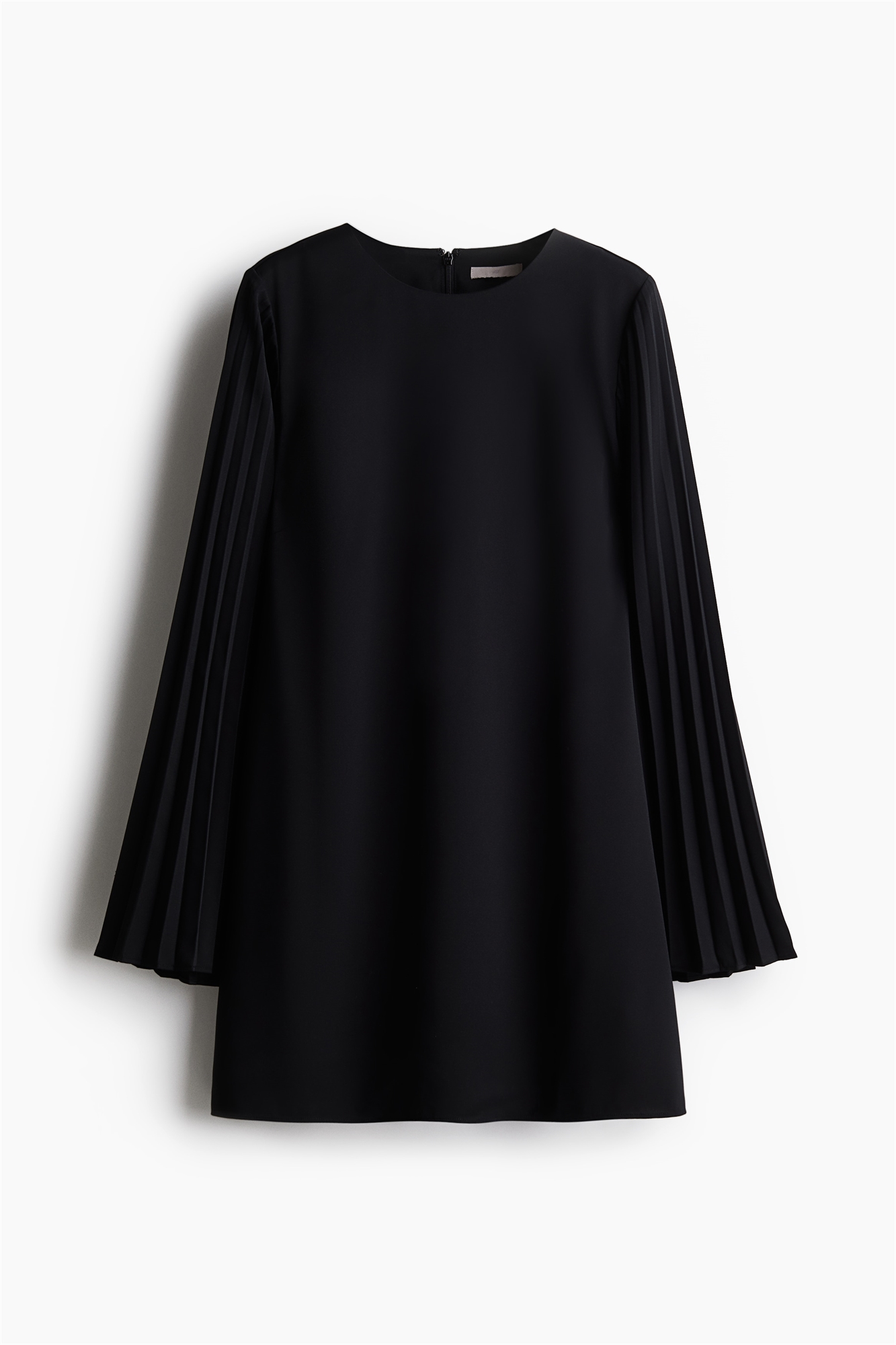 Короткое платье из крепа с круглым вырезом, потайной застежкой на молнию и крючком сзади и длинными рукавами с плиссировкой. Без подкладки.