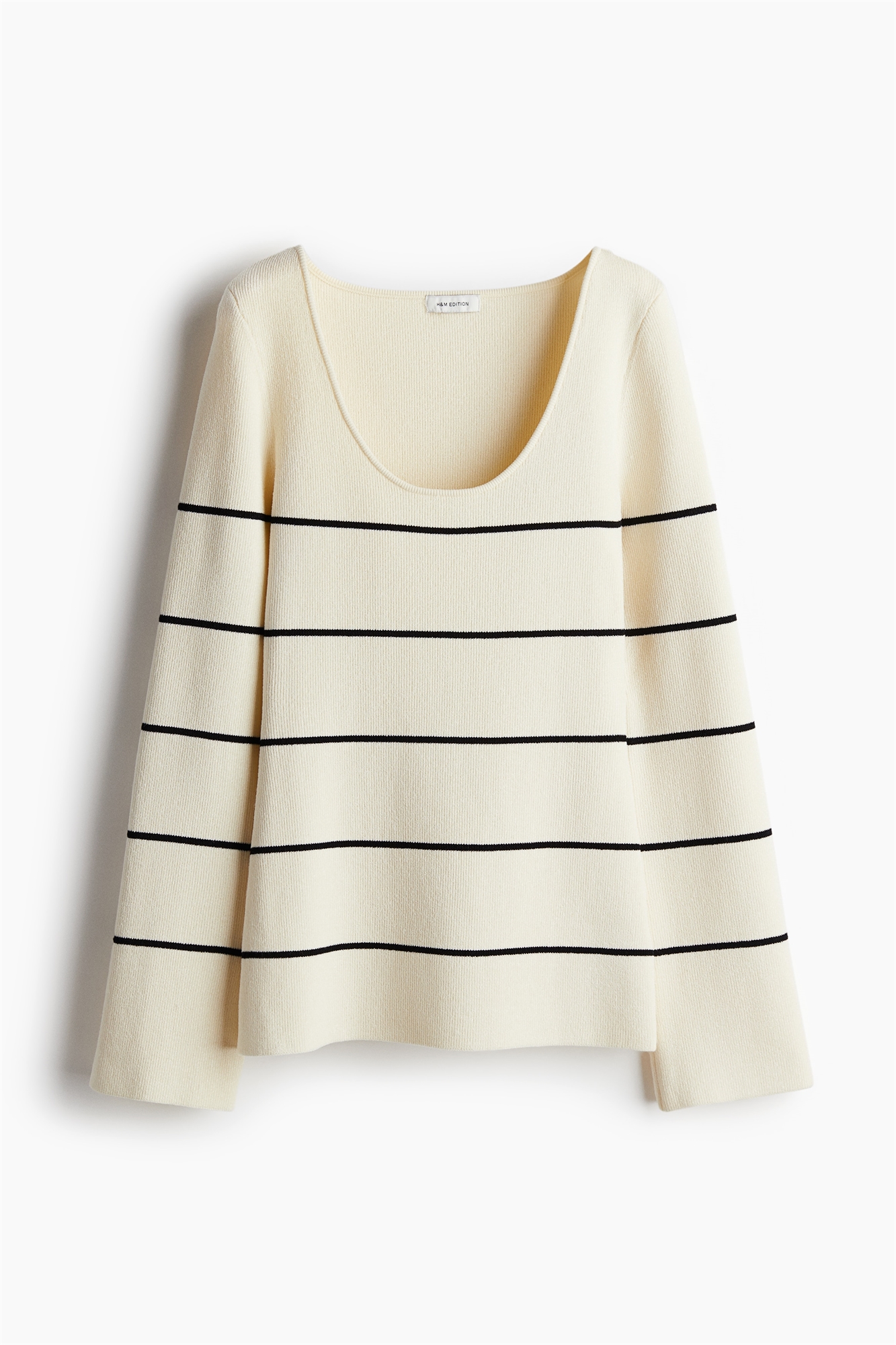 Приталенный джемпер из плотного трикотажа с вырезом "совок" и длинными рукавами.