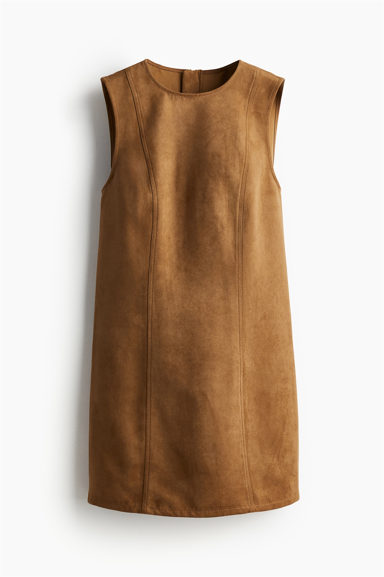 Короткое платье А-линии из саржи без рукавов с круглым вырезом, потайной застежкой-молнией сзади, открытыми задними карманами и видимыми швами спереди и сзади. Без подкладки.