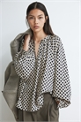 Свободная блузка из саржи с воротником-бантом со складками по всему периметру и V-образной проймой спереди. Длинные рукава реглан с узкими манжетами на пуговицах.
