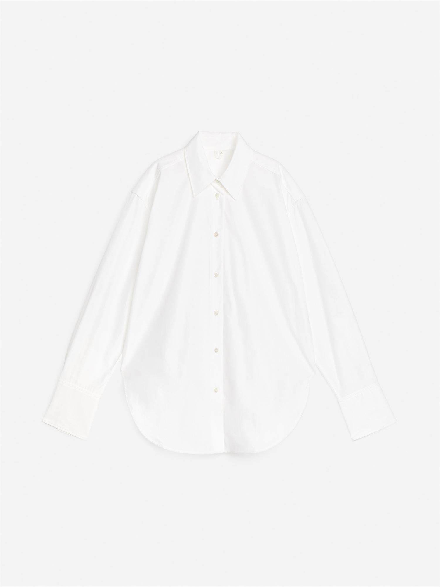 Рубашка с длинными рукавами сшита из хрустящего хлопкового поплина. Рубашка на пуговицах с непринужденным, но нарядным силуэтом.