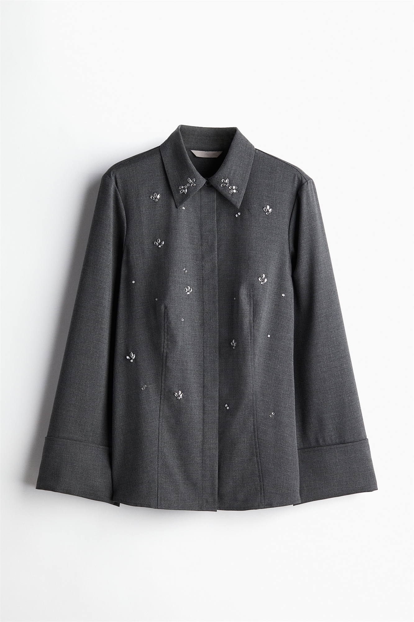 Рубашка из тканого материала, украшенная спереди сверкающими стразами. Воротник, потайные пуговицы спереди, формирующие швы для зауженной талии и длинные рукава с широкими отложными манжетами с пуговицей.