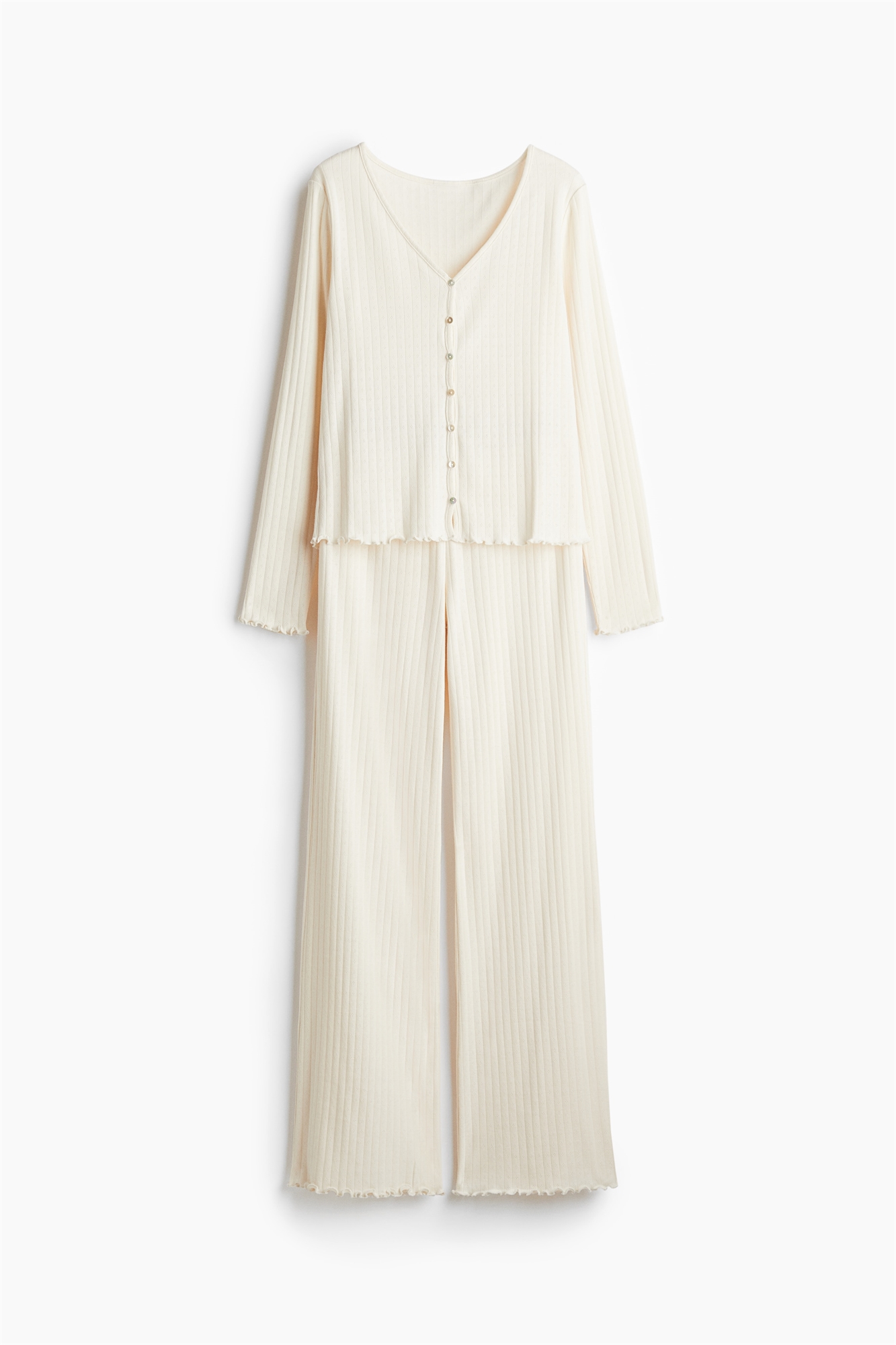 Пижама с верхом и низом из мягкого трикотажа пуантель. Топ с длинными рукавами, V-образным вырезом горловины, пуговицами спереди и оверлоками на манжетах и подоле. Низ с эластичной резинкой на талии и оверлоком по подолу.
