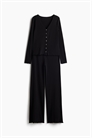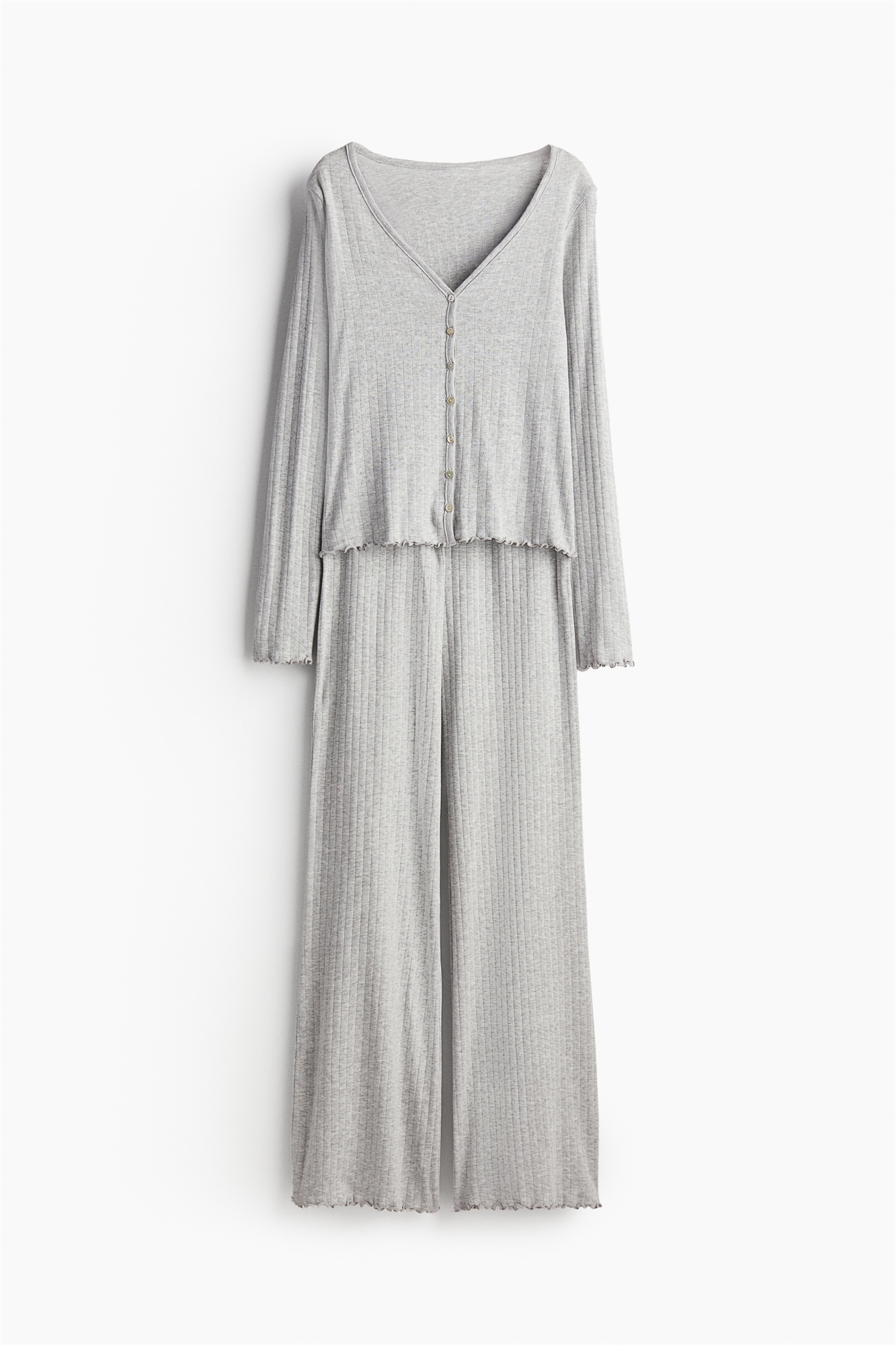Пижама с верхом и низом из мягкого трикотажа пуантель. Топ с длинными рукавами, V-образным вырезом горловины, пуговицами спереди и оверлоками на манжетах и подоле. Низ с эластичной резинкой на талии и оверлоком по подолу.