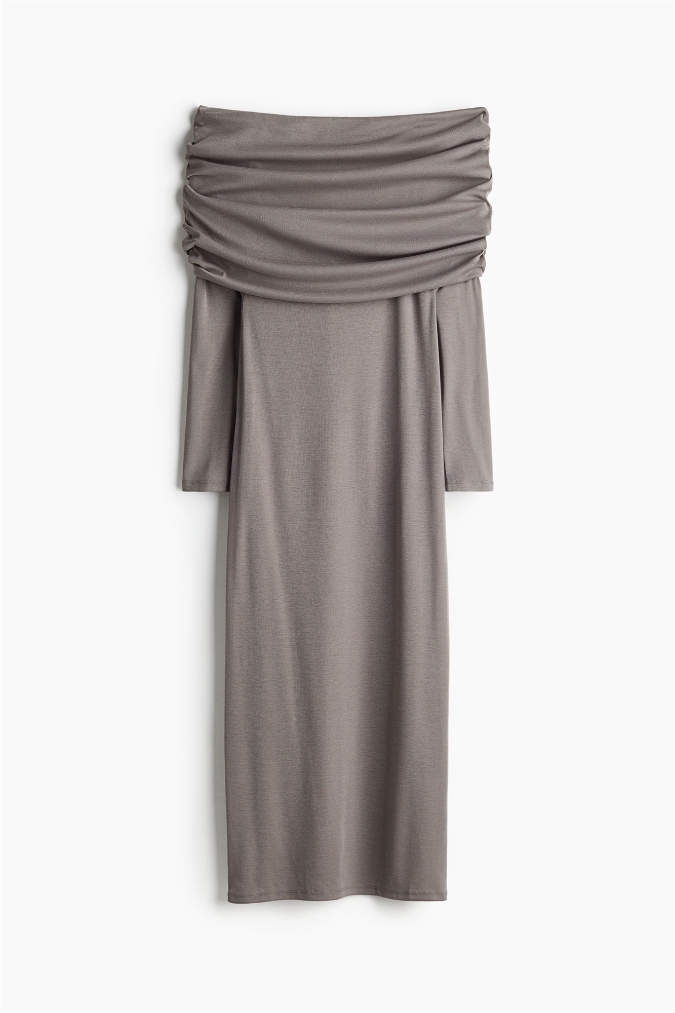 Приталенное платье без плеч длиной до колен из ребристого джерси. Широкий отложной верхний край со складками по бокам, создающими эффект легкой драпировки. Длинные рукава и прямой подол.