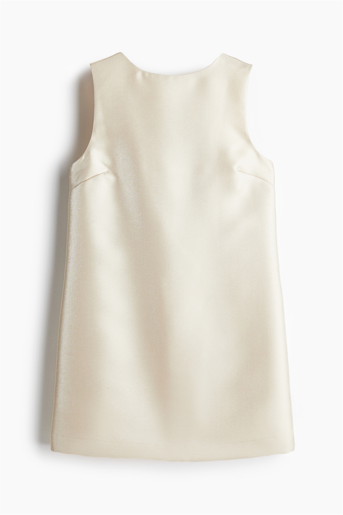 Короткое, слегка А-линейное платье из тканого материала с легким блеском. Силуэт без рукавов, круглый вырез и низкая V-образная спинка с декоративным бантом.