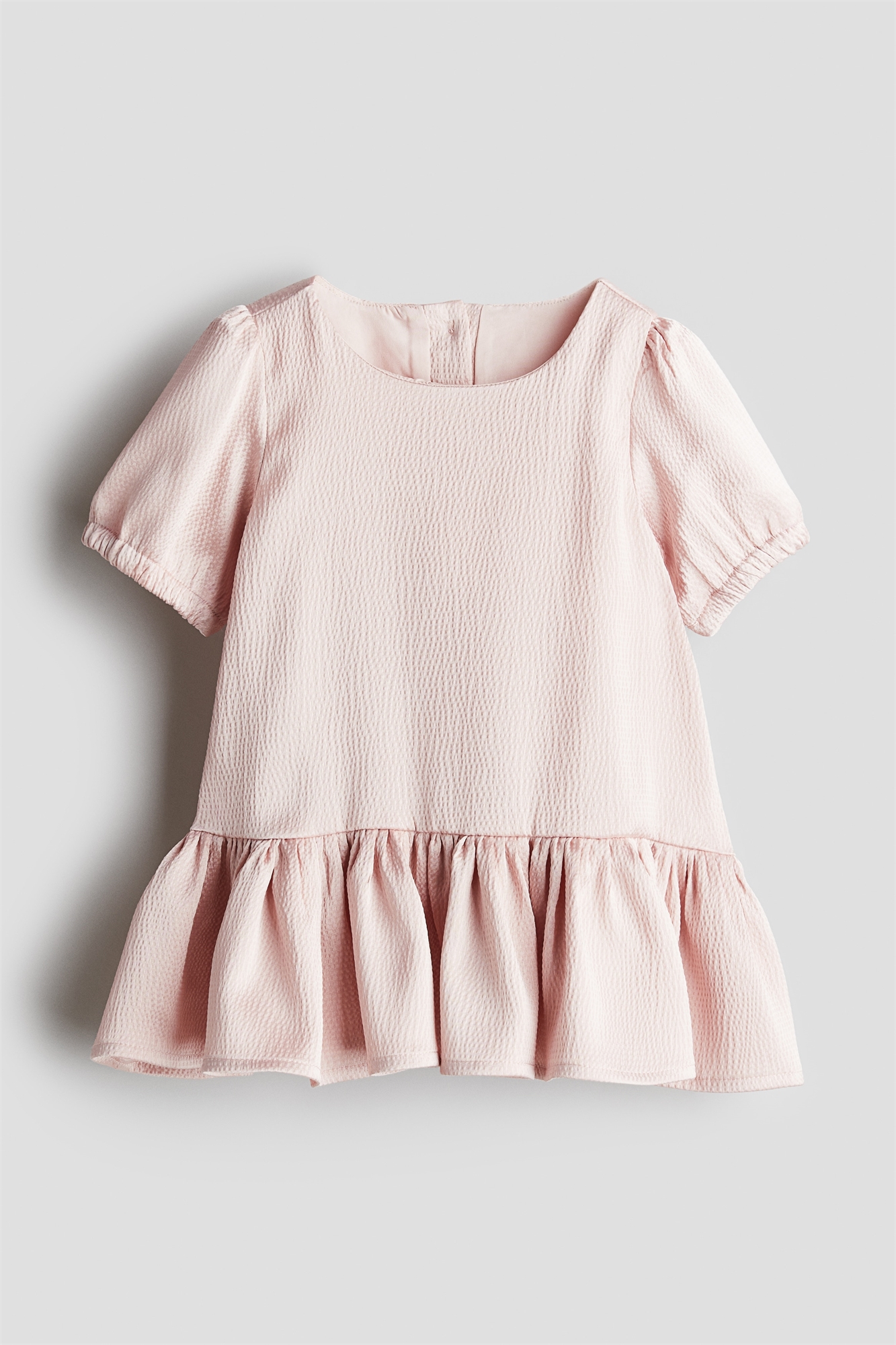 Платье с короткими рукавами из фактурного плетения с круглым вырезом, застежкой на пуговицы сзади и пышными рукавами с узкими эластичными манжетами. Собранный ниже талии расклешенный подол. Верхняя часть на подкладке.