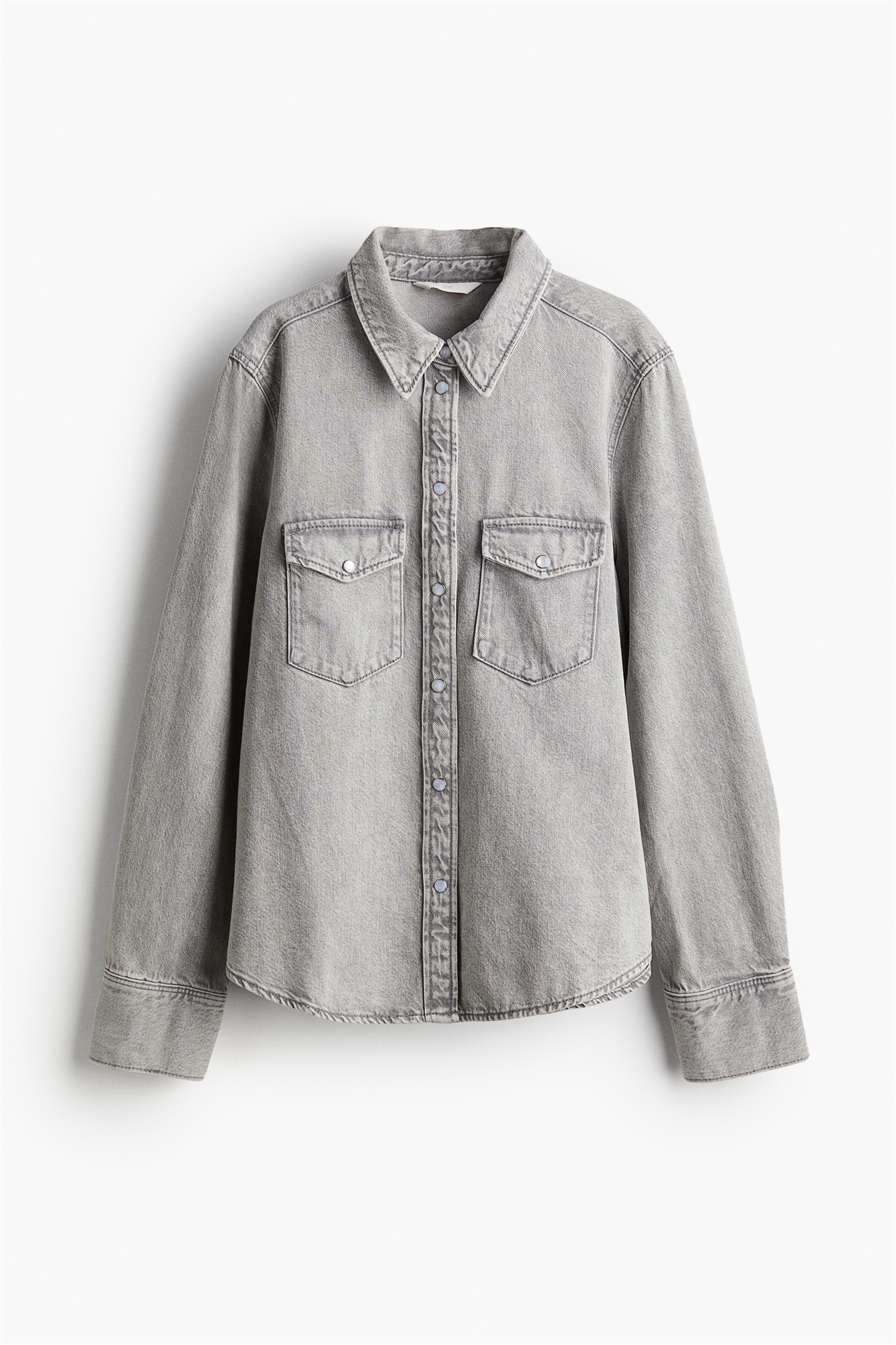 Рубашка из денима с воротником и кнопками для печати спереди. Накладные нагрудные карманы с клапаном и кнопкой, V-образный выступ сзади и длинные рукава с кнопками на манжетах. Аккуратный закругленный подол.