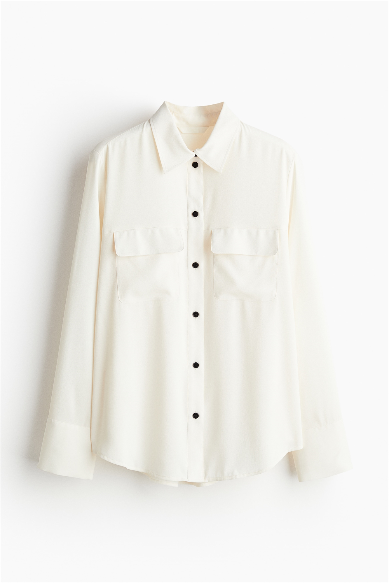 Рубашка из крепового переплетения с воротником и пуговицами спереди. Двухслойная стойка с боковыми складками сзади, нагрудные карманы с клапанами и длинные рукава с широкими манжетами на пуговицах и рукавной планкой с пуговицей. Аккуратный закругленный подол.