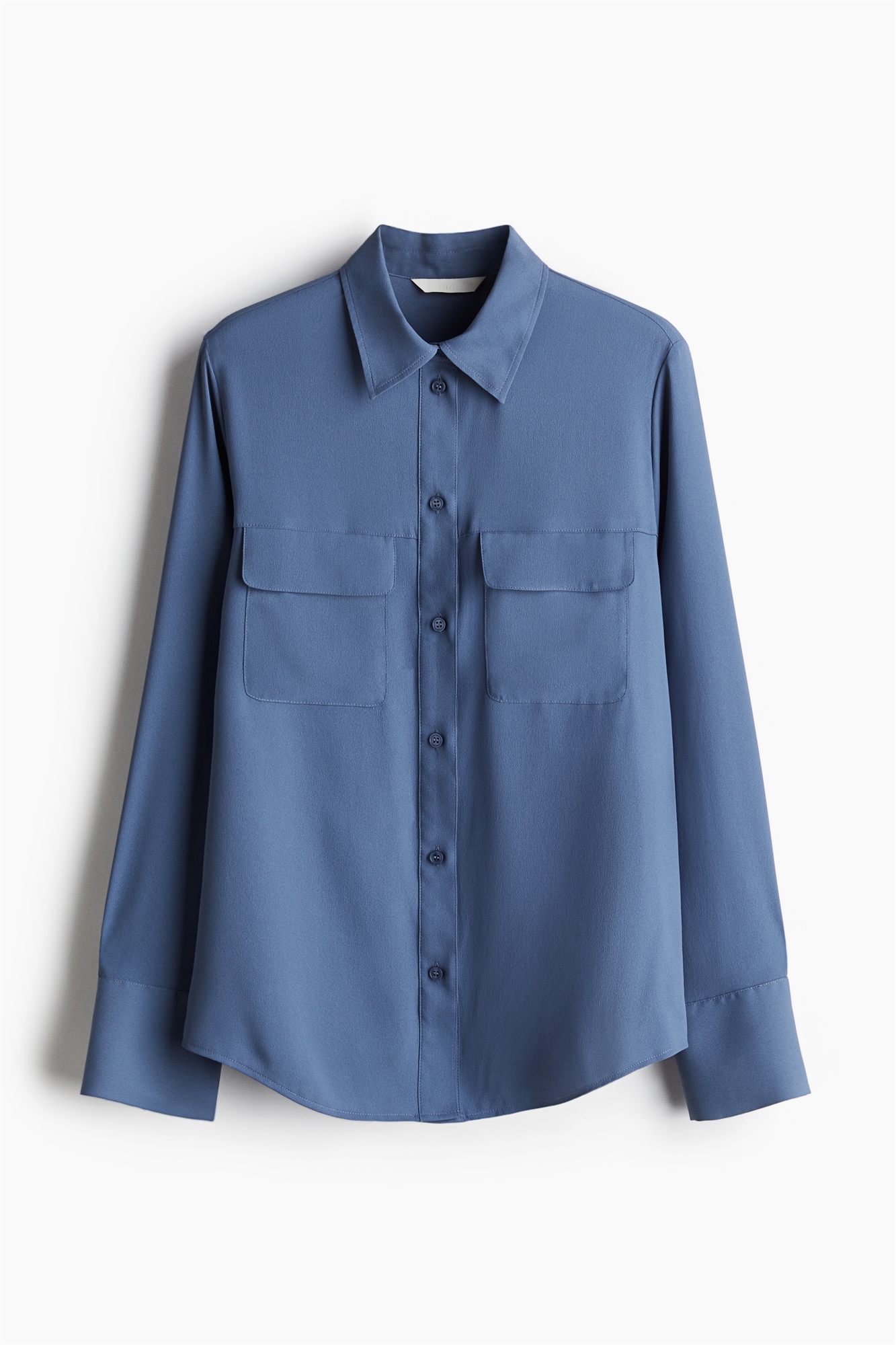 Рубашка из крепового переплетения с воротником и пуговицами спереди. Двухслойная стойка с боковыми складками сзади, нагрудные карманы с клапанами и длинные рукава с широкими манжетами на пуговицах и рукавной планкой с пуговицей. Аккуратный закругленный подол.