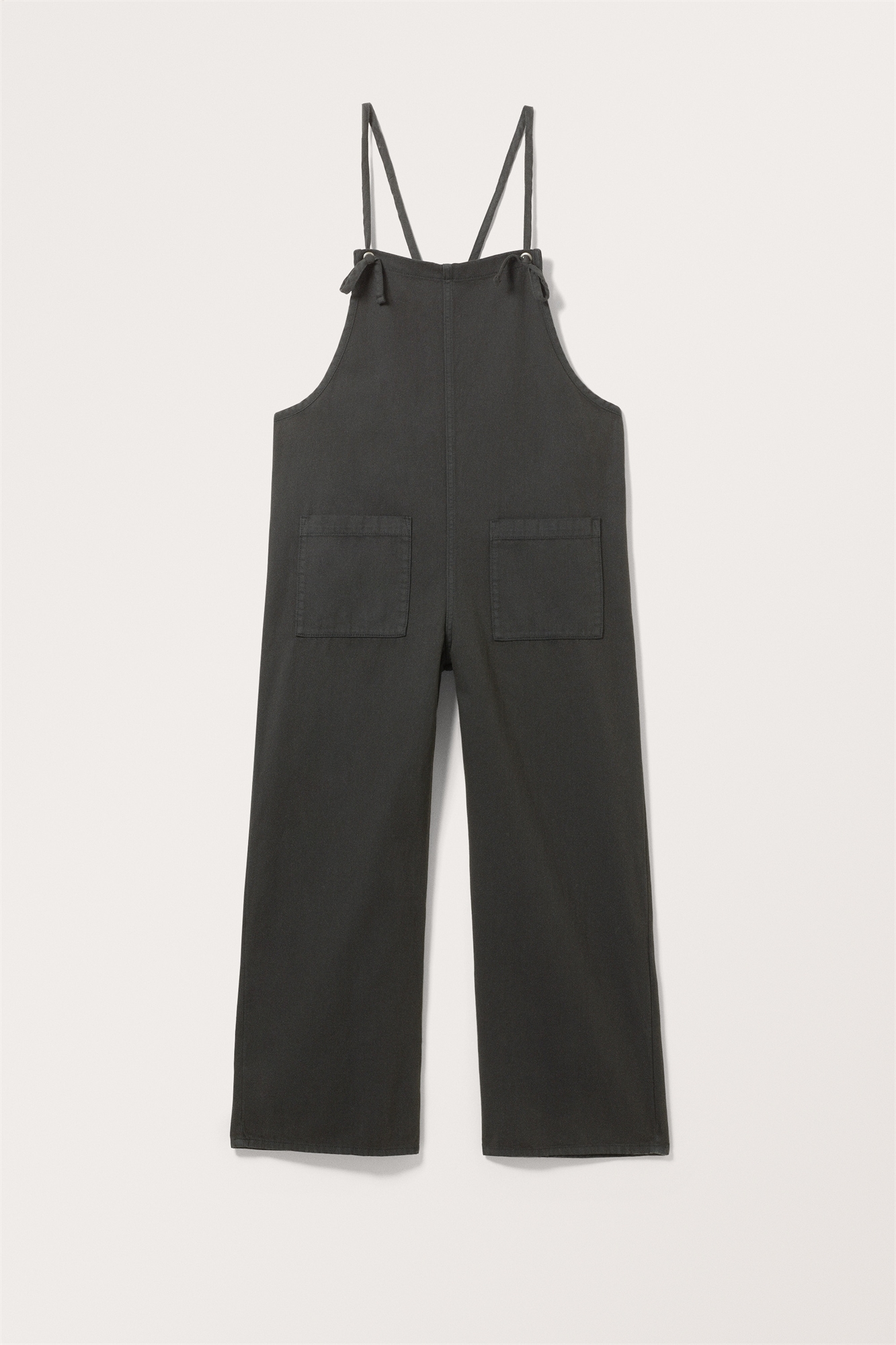 Пара полукомбинезонов из плотного хлопкового денима. Застежка на завязках, квадратный вырез, накладные карманы спереди и сзади. Регулярный крой. Полная длина.