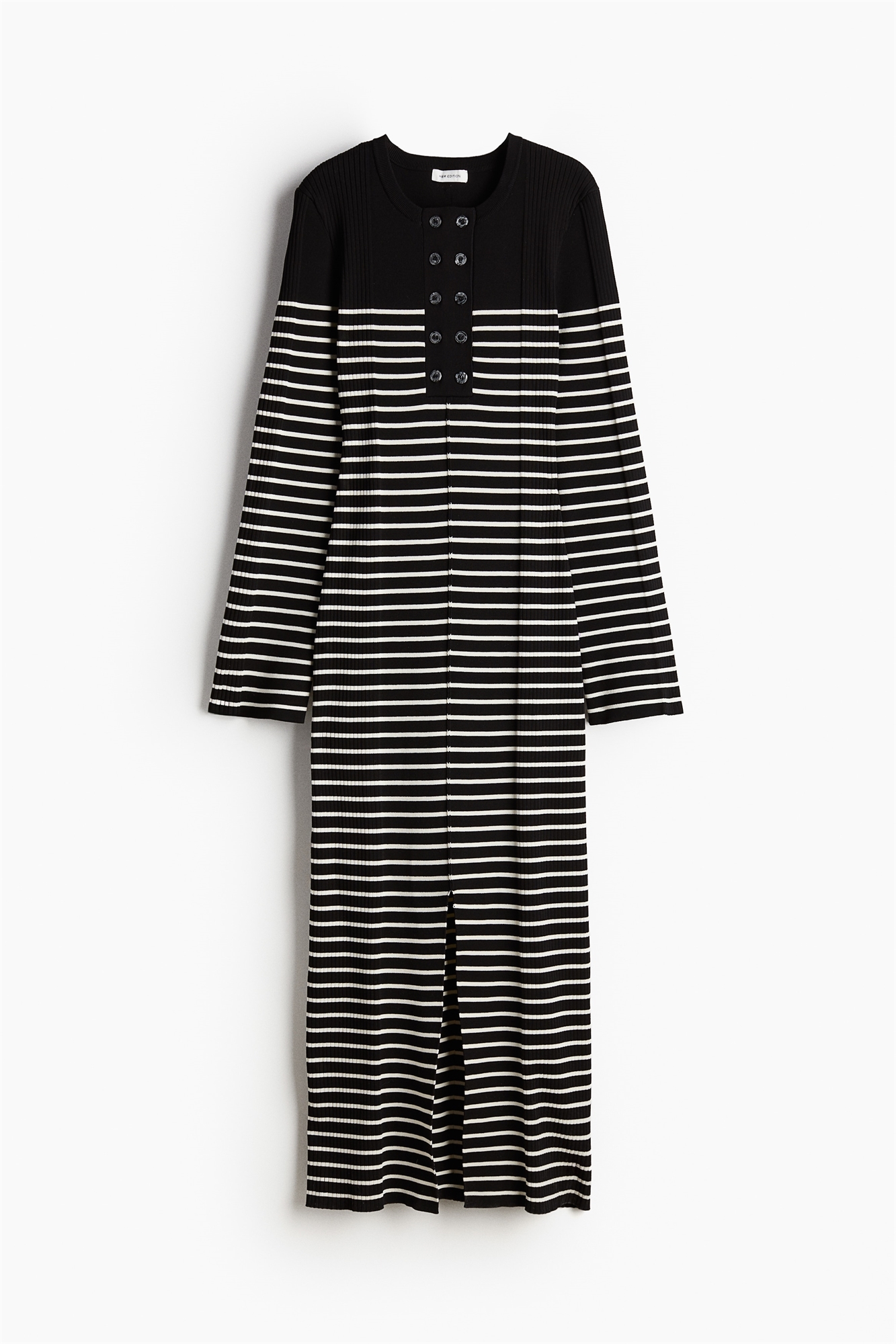 Длинное приталенное платье из плотного трикотажа с ребристой вязкой. Круглый вырез, застежка на пуговицах спереди и длинные, слегка расклешенные рукава. Открытый шов спереди и сзади с разрезом на подоле.