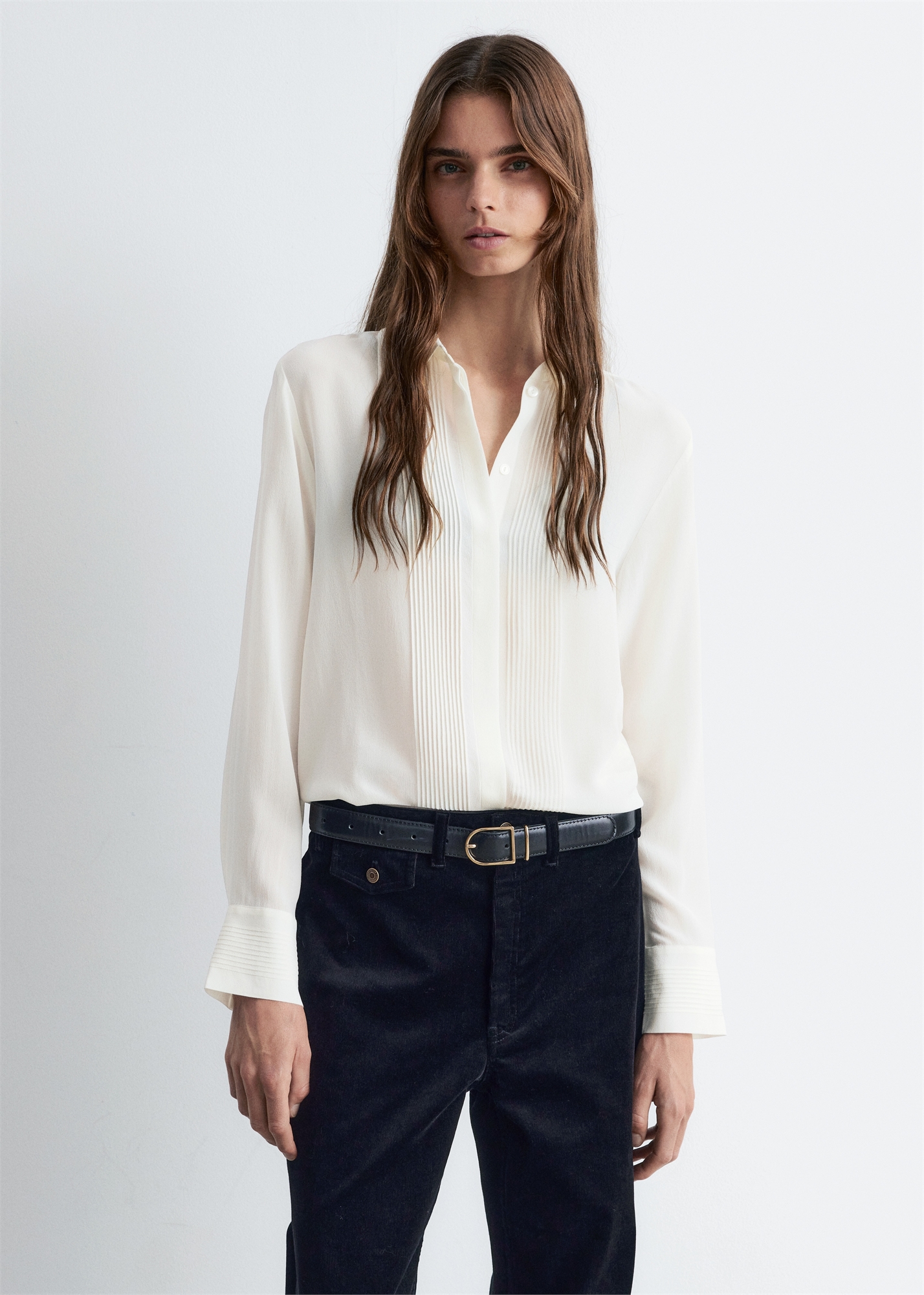 Рубашка с длинными рукавами сшита из шелка. Отделана пинтаком вдоль воротника и на манжетах. • Скрытая застежка на пуговицах • Манжеты на пуговицах • Длина рубашки: 71 см / 28" (размер S)