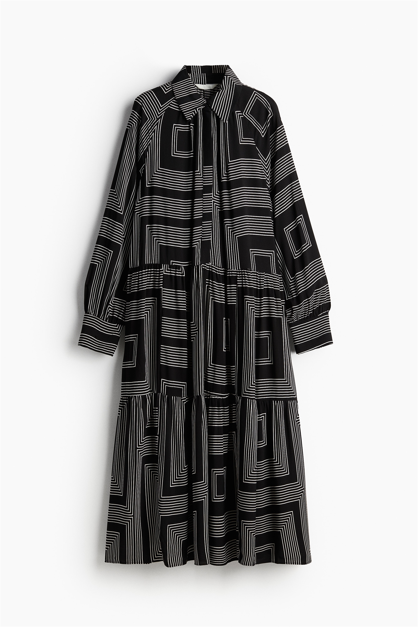 Платье длиной до колен из вискозного полотна с воротником и потайной застежкой на пуговицах спереди. Длинные рукава реглан с разрезом и пуговицей на манжетах. Присборенный шов над бедрами и коленями для придания дополнительного объема. Без подкладки.