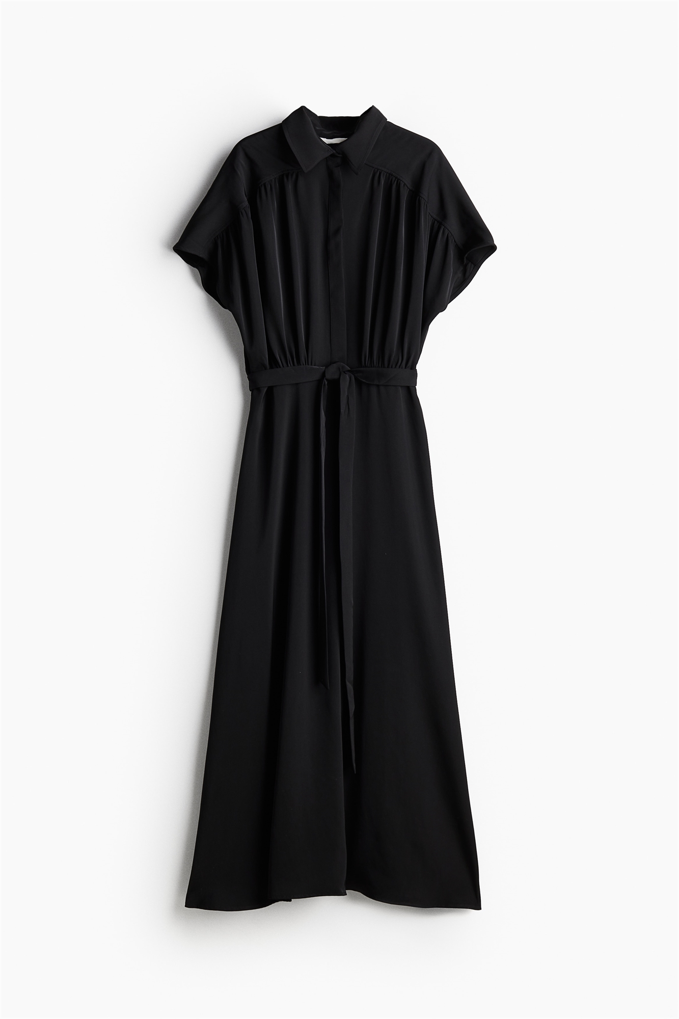 Платье длиной до щиколоток из саржи с легким блеском. Воротник, короткие рукава и ярмо со складками спереди и сзади. Потайные пуговицы вверху, эластичная резинка сзади на талии и съемный пояс-завязка. Без подкладки.
