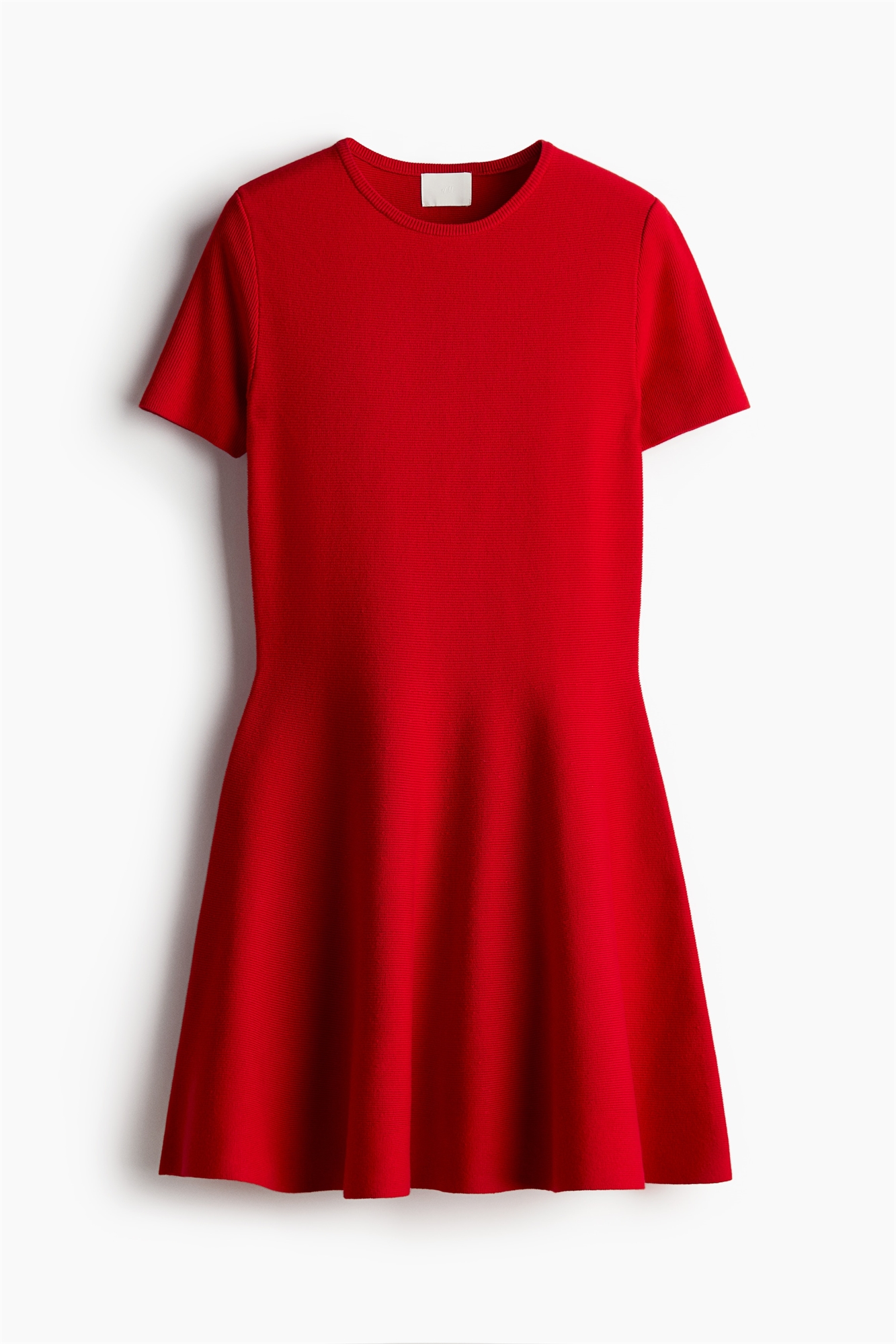 Короткое приталенное платье из плотного трикотажа с круглым вырезом с ребристой отделкой, короткими рукавами и расклешенной юбкой.