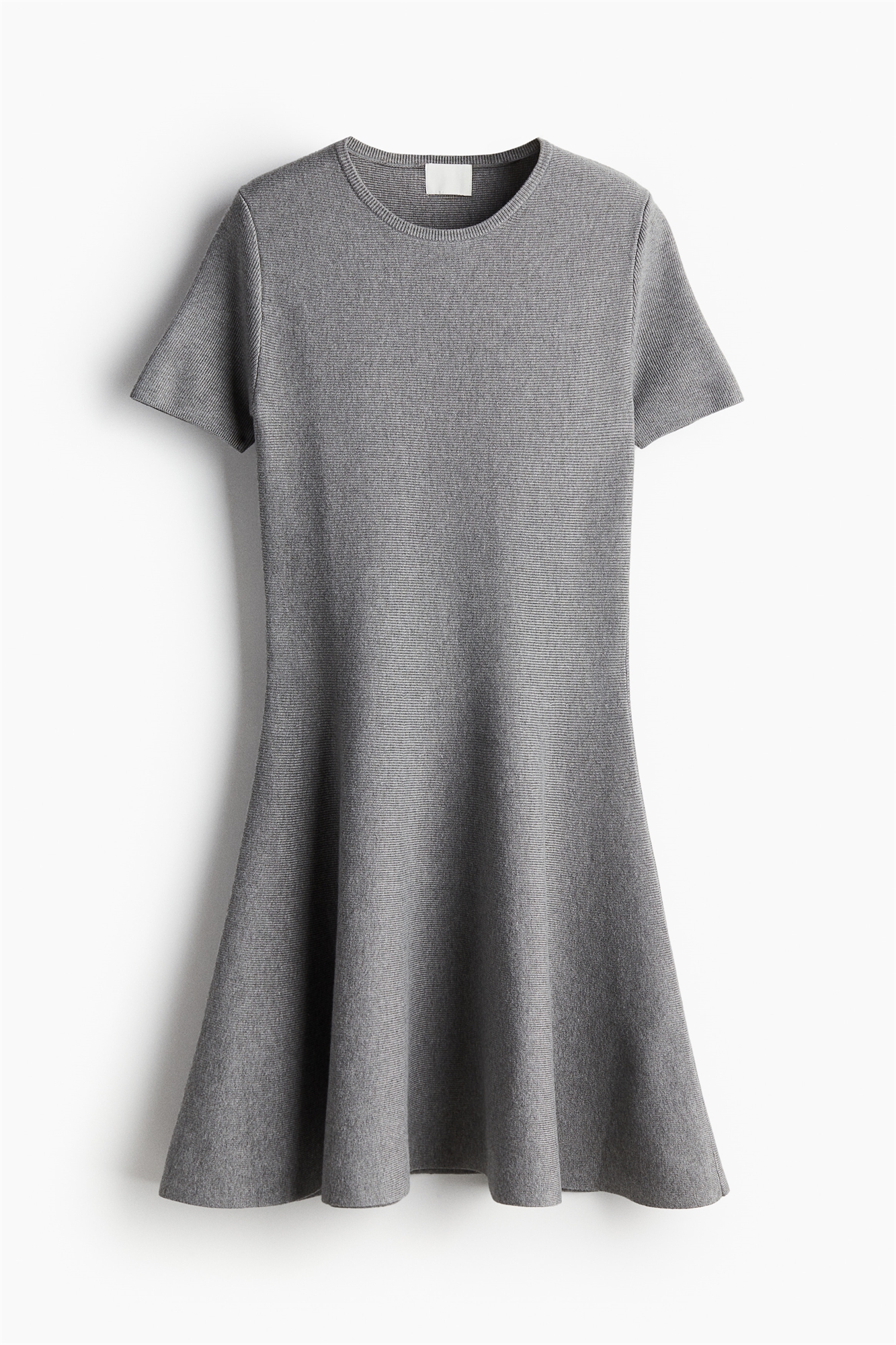 Короткое приталенное платье из плотного трикотажа с круглым вырезом с ребристой отделкой, короткими рукавами и расклешенной юбкой.
