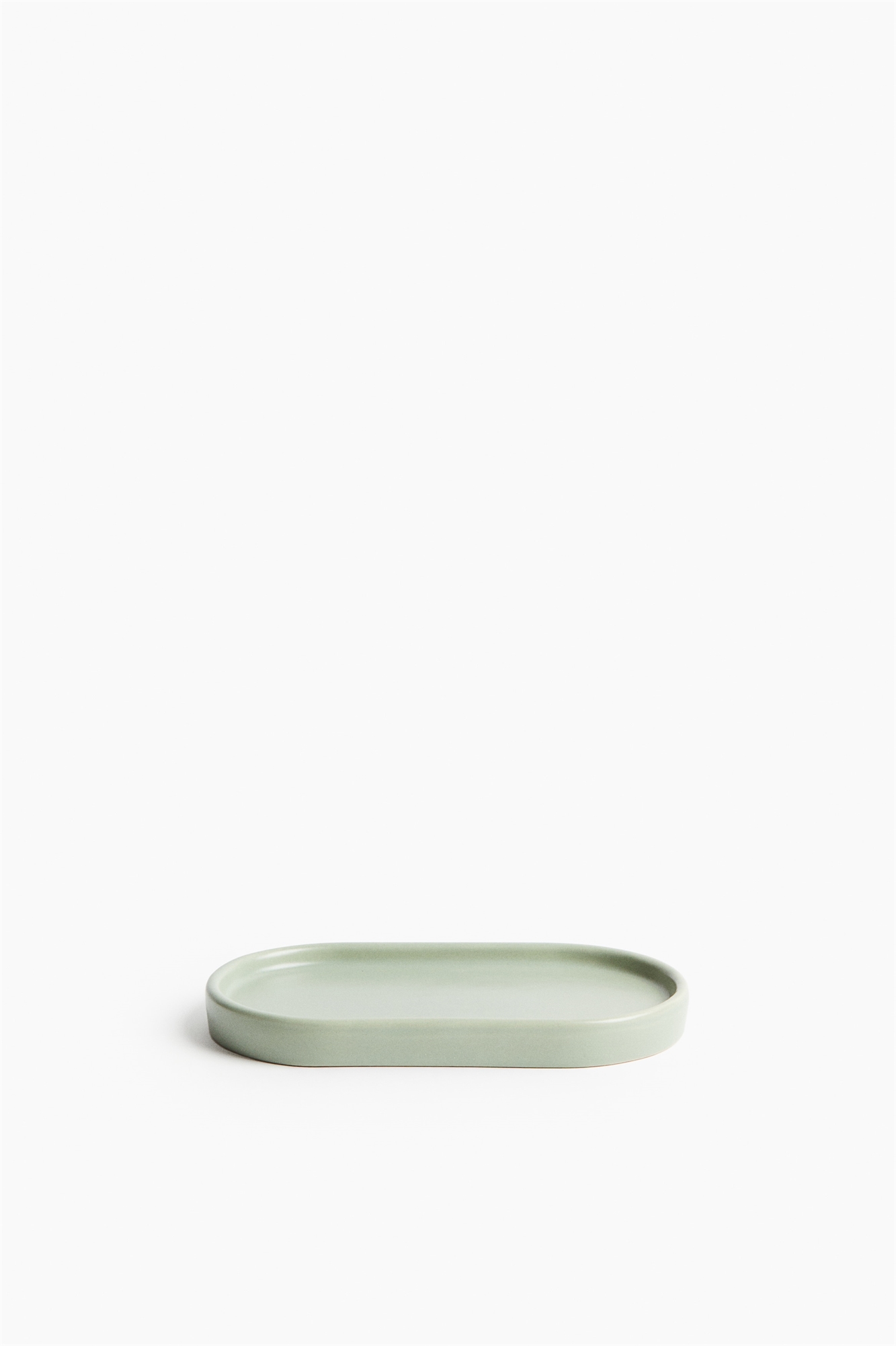 Овальный поднос из глазурованной керамики с низким бортиком. Высота 1 см. Ширина 8 см. Длина 16 см.