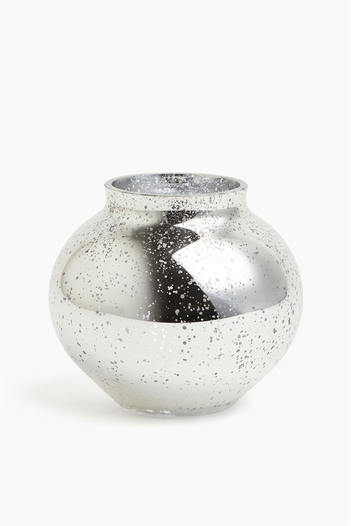 Шарообразная ваза, сужающаяся к горлышку. Изготовлена из стекла с блестящей отделкой. Высота 10 см. Диаметр в самом широком месте 11,5 см.