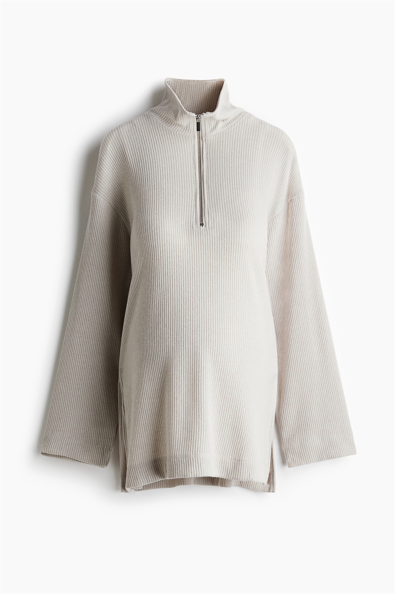 Джемпер свободного покроя из мягкого трикотажа в рубчик с высоким воротником и застежкой-молнией в верхней части. Спущенные плечи, удлиненные рукава и прямой подол с разрезом с каждой стороны. Джемпер можно носить как во время, так и после беременности.