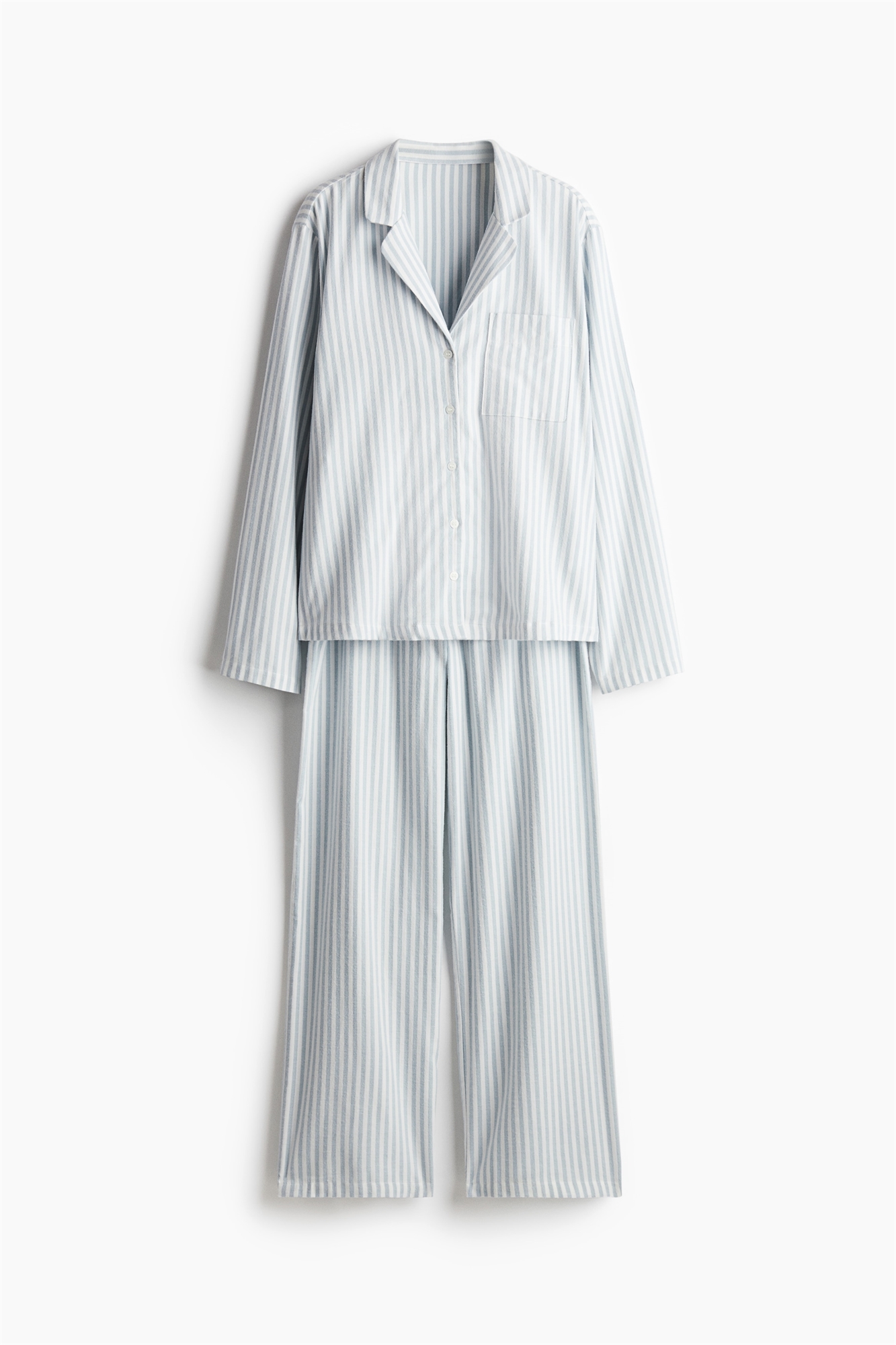 Пижама с рубашкой и нижней частью из мягкой хлопковой фланели. Рубашка с отложным воротником, пуговицами спереди, накладным нагрудным карманом и длинными рукавами. Нижние штанишки с эластичным утягивающим поясом.