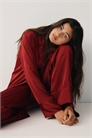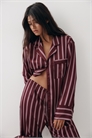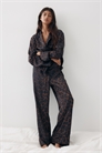 Пижама с рубашкой и нижней частью из мягко драпирующегося атласа с отделкой акцентного цвета. Рубашка с отложным воротником, пуговицами спереди, открытым нагрудным карманом и длинными рукавами. Нижние штанишки с эластичным утягивающим поясом и широкими ножками.