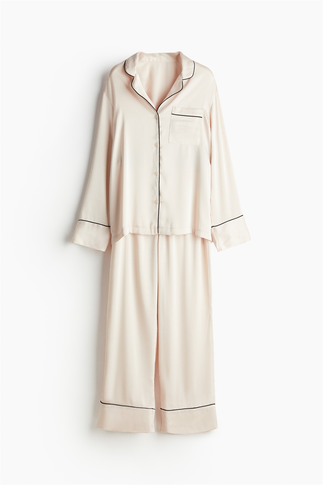 Пижама с рубашкой и нижней частью из мягко драпирующегося атласа с отделкой акцентного цвета. Рубашка с отложным воротником, пуговицами спереди, открытым нагрудным карманом и длинными рукавами. Нижние штанишки с эластичным утягивающим поясом и широкими ножками.