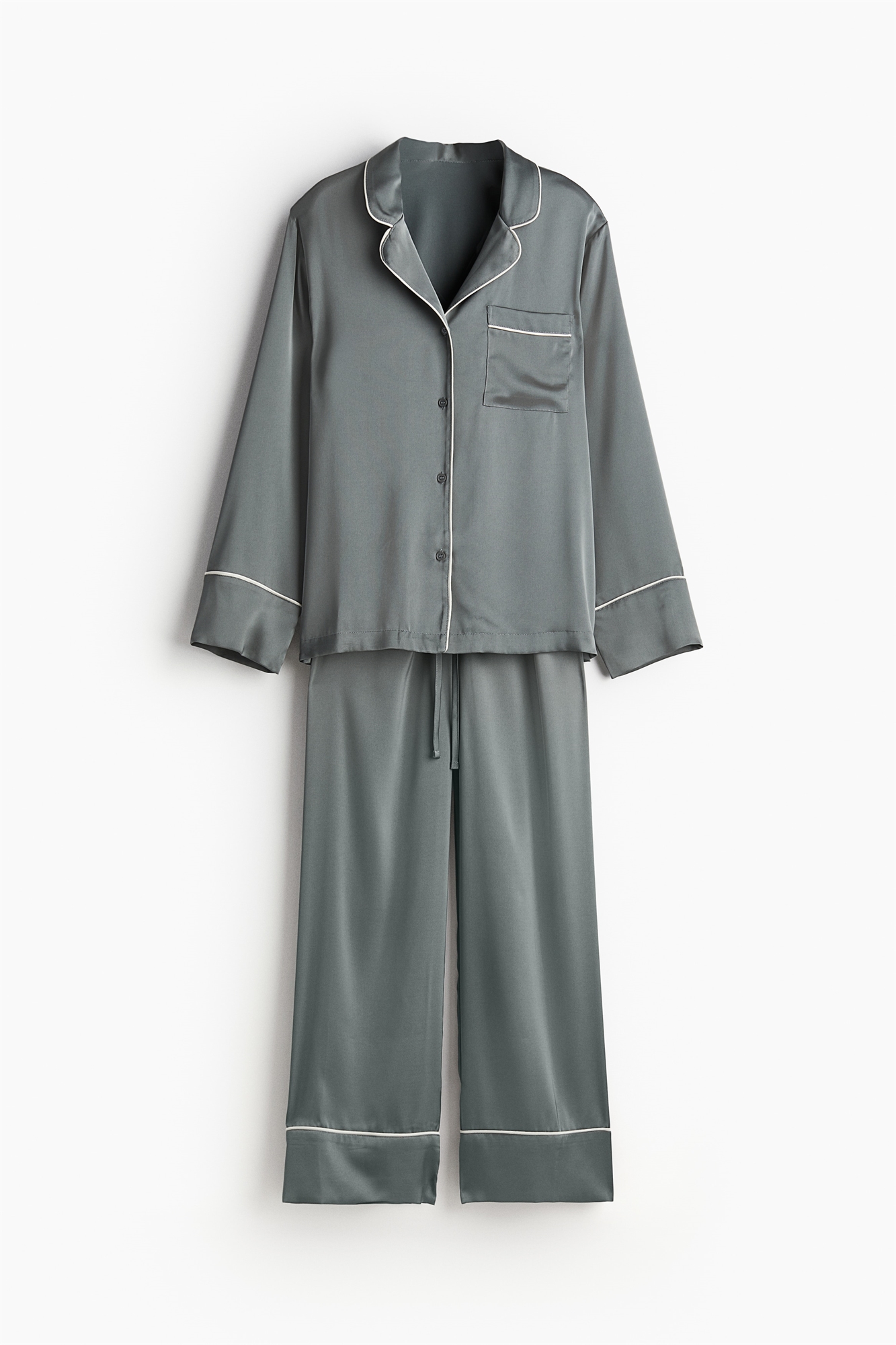 Пижама с рубашкой и нижней частью из мягко драпирующегося атласа с отделкой акцентного цвета. Рубашка с отложным воротником, пуговицами спереди, открытым нагрудным карманом и длинными рукавами. Нижние штанишки с эластичным утягивающим поясом и широкими ножками.