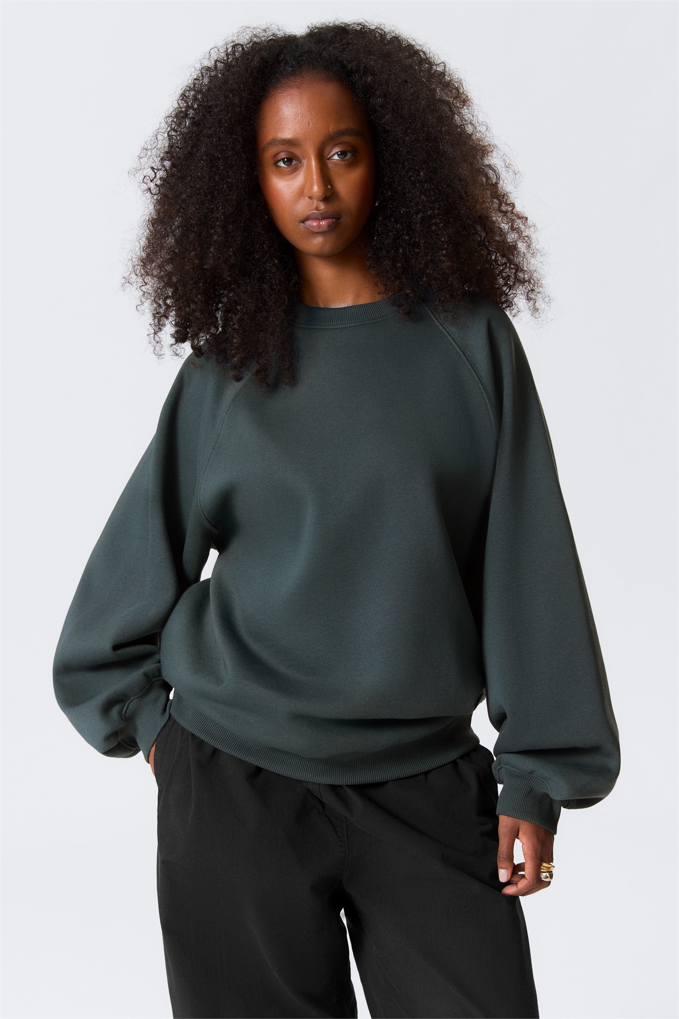 Свитер свободного кроя из плотной смеси хлопка и переработанного полиэстера с добавлением вискозы. Этот фаворит имеет ребристую горловину, просторные рукава реглан и ребристые края, придающие ему пышный силуэт.