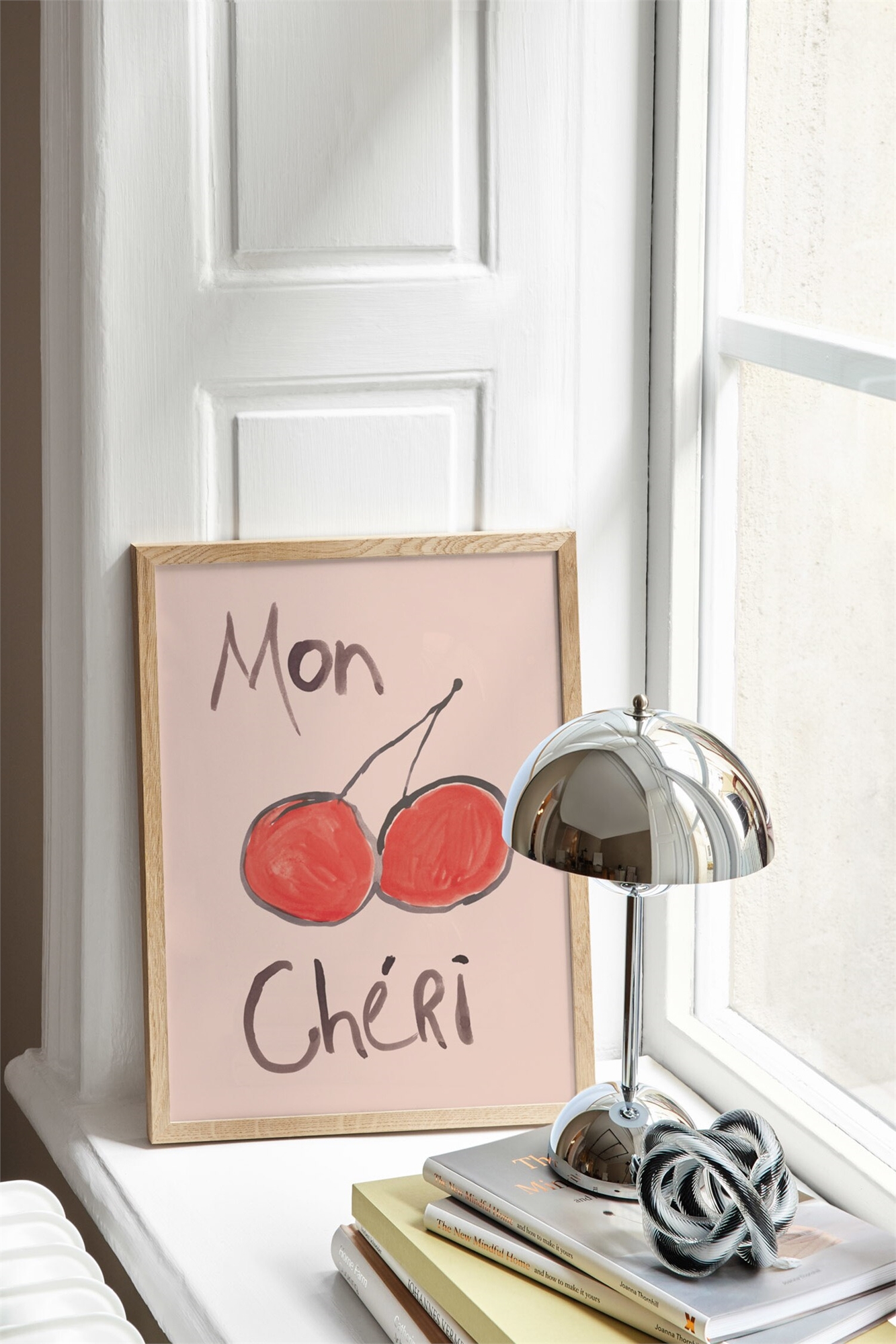 Ручная роспись с изображением двух крупных красных вишен, очерченных черными линиями на розовом фоне. Надпись на французском языке переводится как "Моя дорогая". Мотив входит в коллекцию "Atelier No. 02", созданную нашими дизайнерами для Postery Atelier.