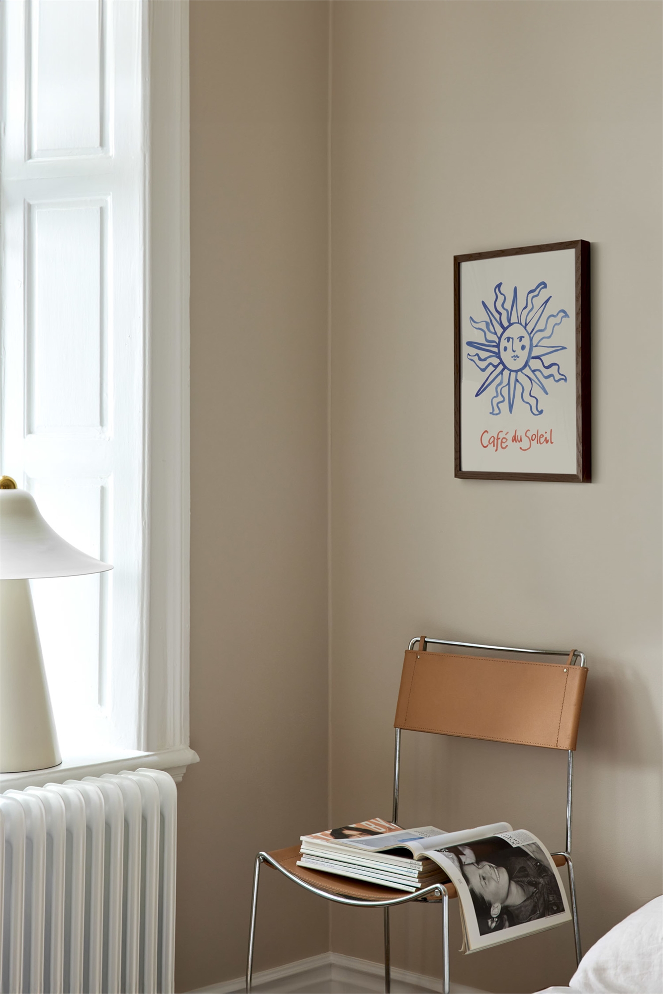 Ручная роспись на тему кафе с изображением классического символа солнца Apollo в синем и красном цветах в качестве визуального центра. Французский текст переводится как "Кафе Солнца". Мотив является частью коллекции "Atelier No. 02", созданной нашими дизайнерами для Postery Atelier.