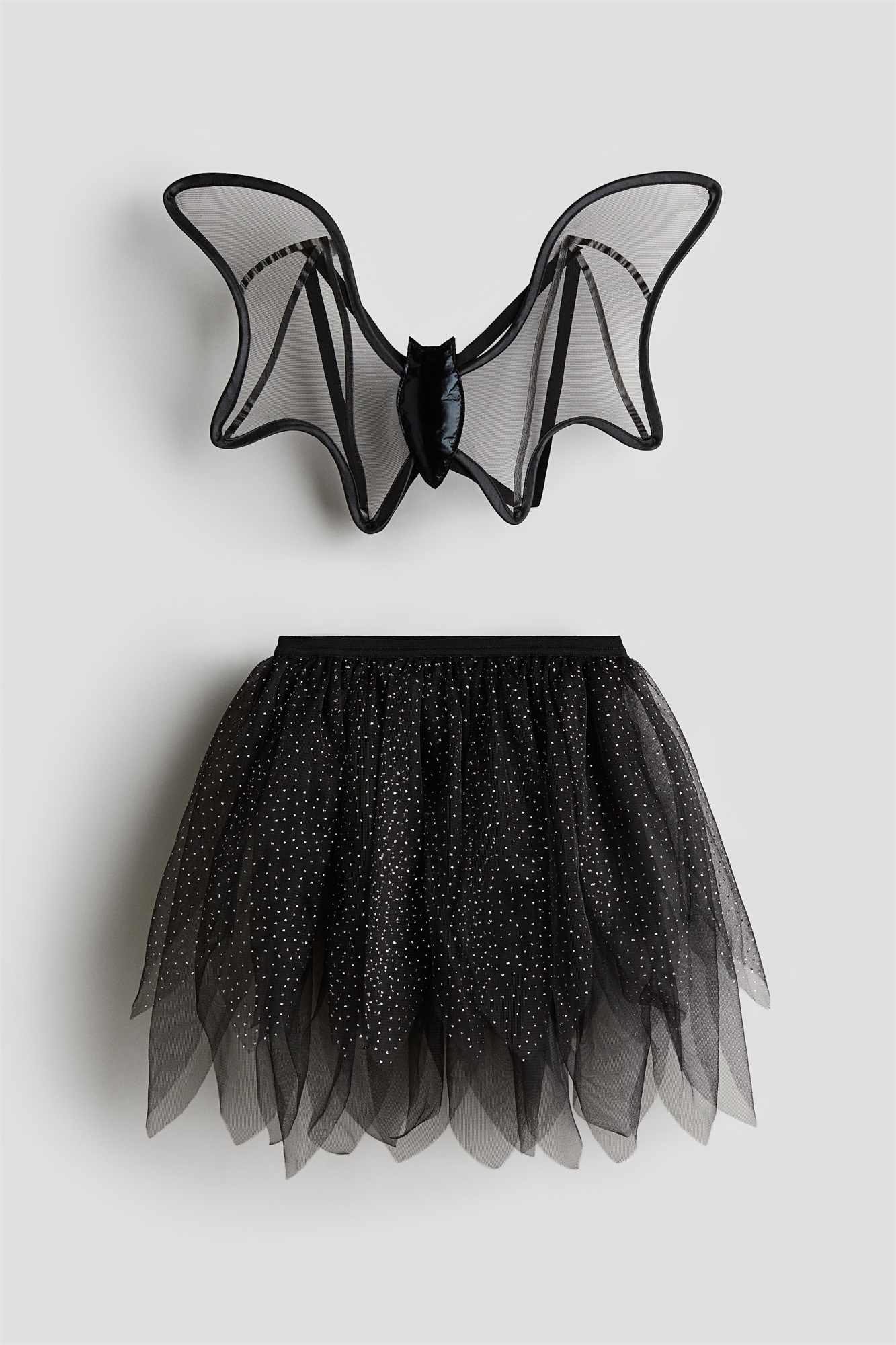 Маскарадный костюм с блестящей юбкой и крыльями летучей мыши. Юбка из нескольких слоев фатина с эластичной талией. Крылья из сетки с мягкой аппликацией, резиновыми деталями и эластичными бретелями.