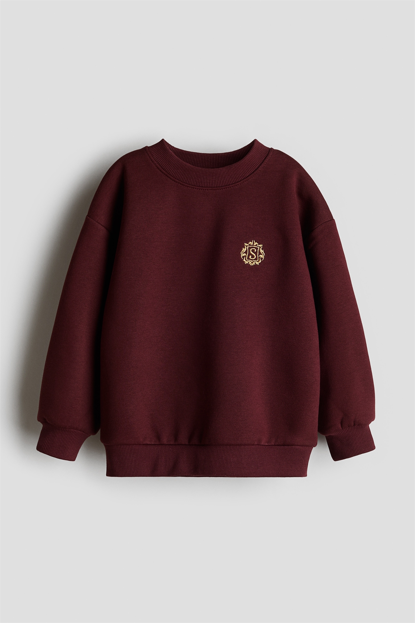 Топ из толстовочной ткани с мягкой начесом внутри и небольшим вышитым мотивом спереди. Круглый вырез в рубчик, спущенные плечи, манжеты и подол в рубчик.