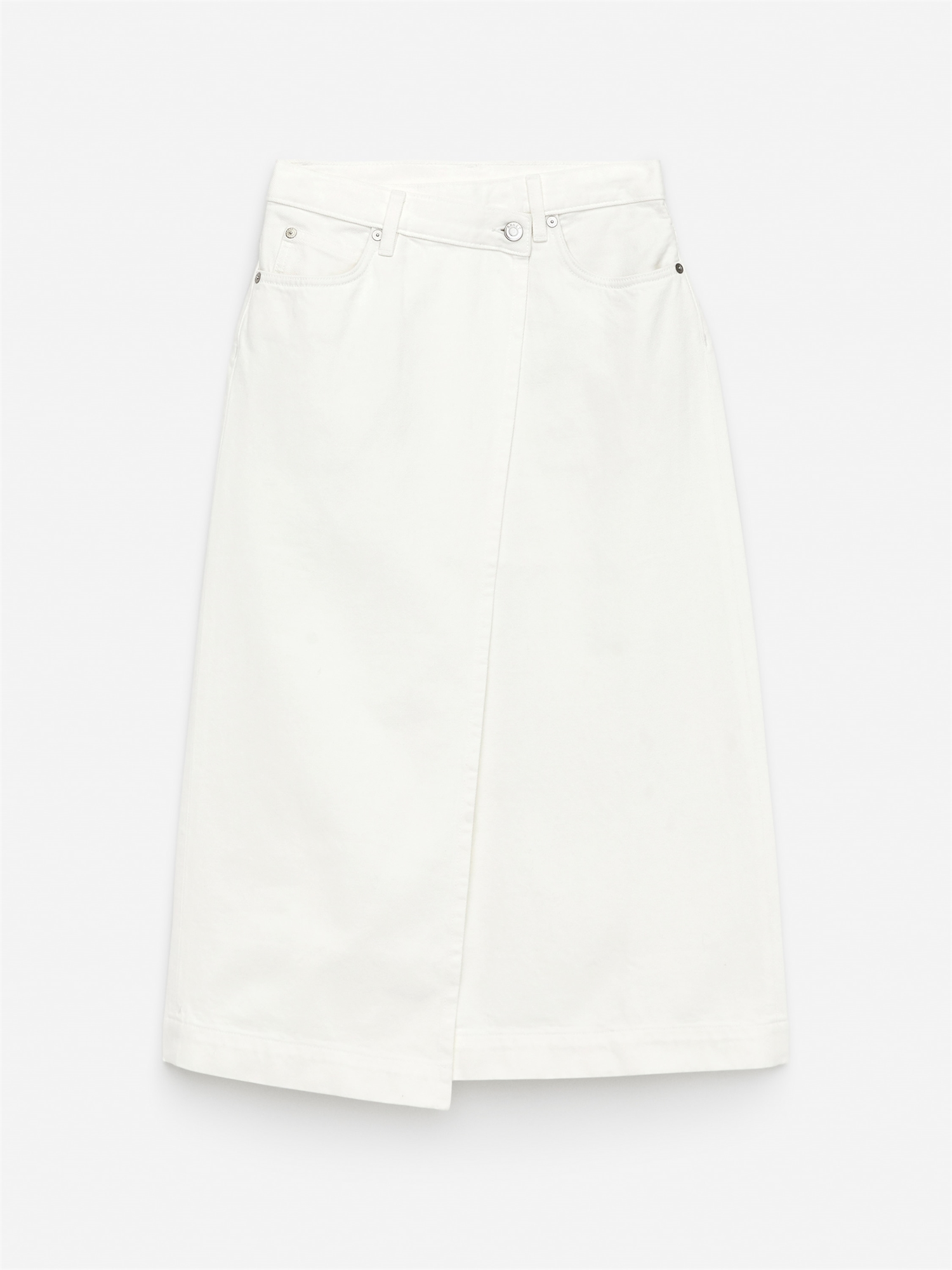Юбка с высокой талией, асимметричным подолом и застежкой на пуговицы. Изготовлена из средней плотности денима с добавлением хлопка.