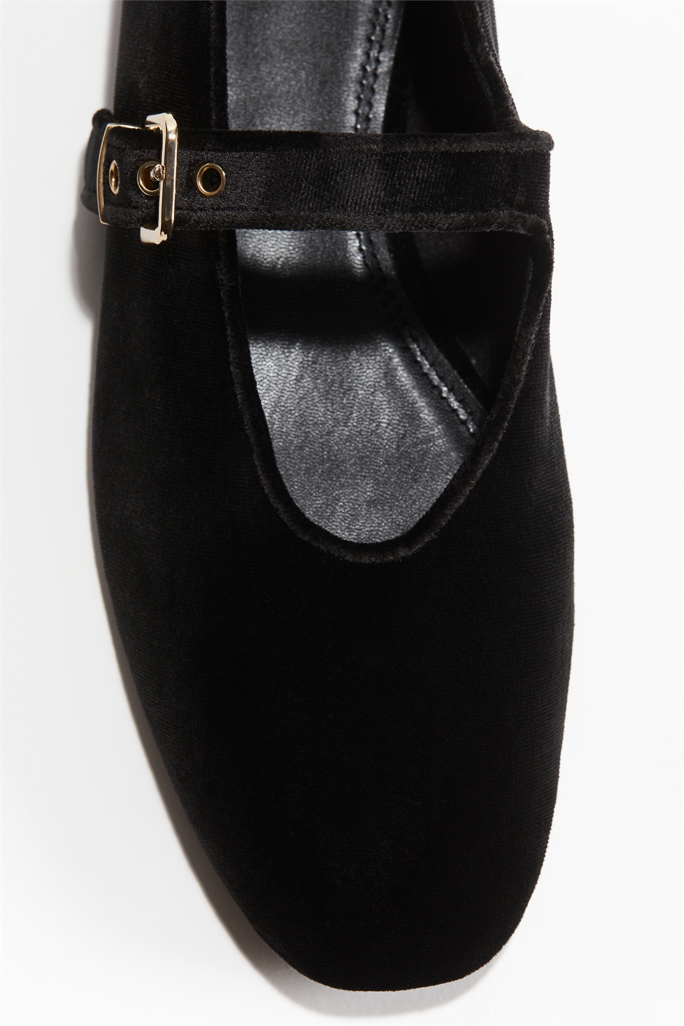 Балетки в стиле Мэри Джейн с миндалевидными носками и регулируемым ремешком на ноге с металлической пряжкой. Аккуратная отделка вдоль проймы и ремешка на ноге.