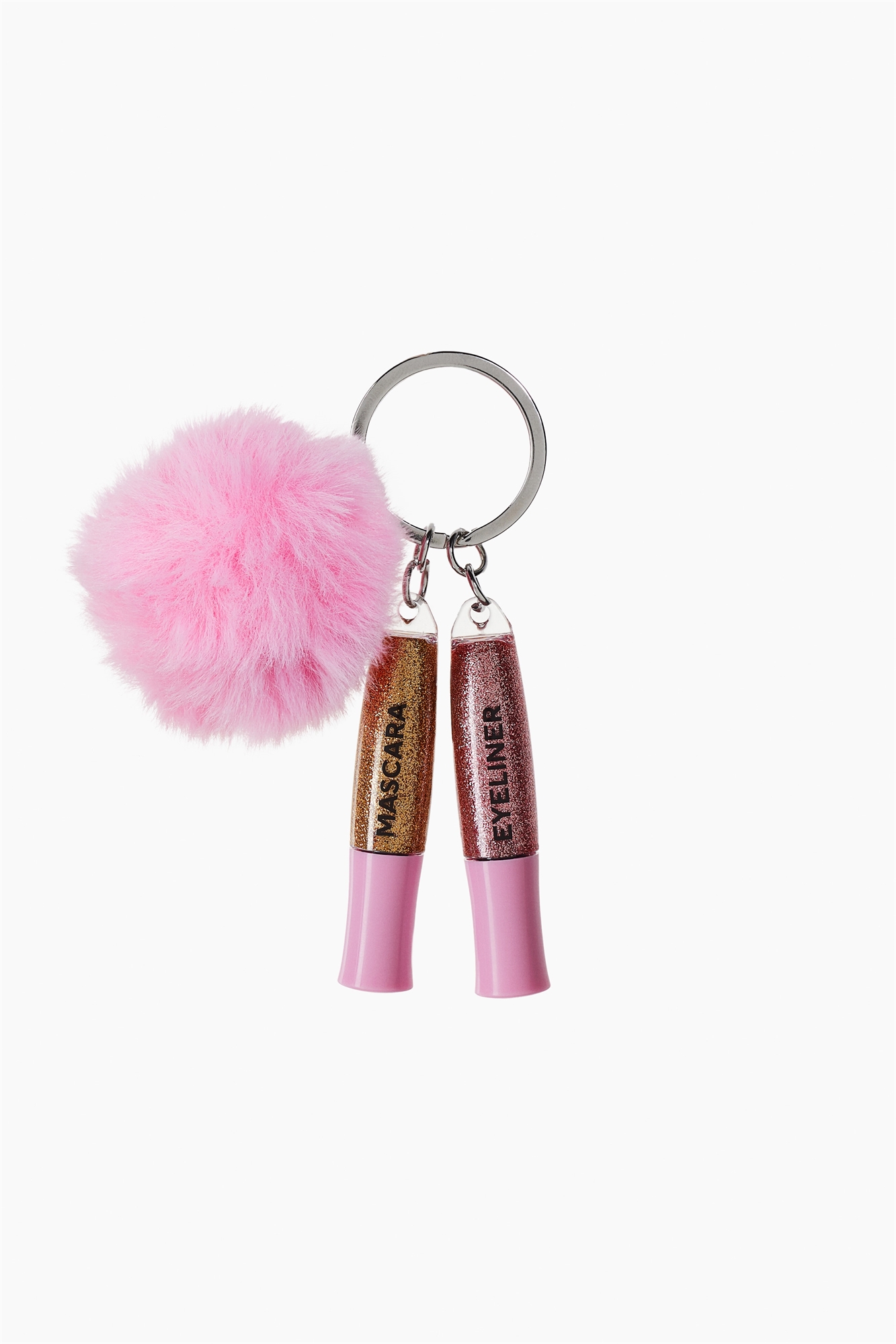 Ограниченная серия. Брелок для ключей с милым помпоном и двумя предметами для макияжа. В комплект входят маленькая тушь для ресниц и подводка для глаз, обе розового цвета с золотистыми блестками для праздничного образа. Веганский продукт. 2x2,1 мл.